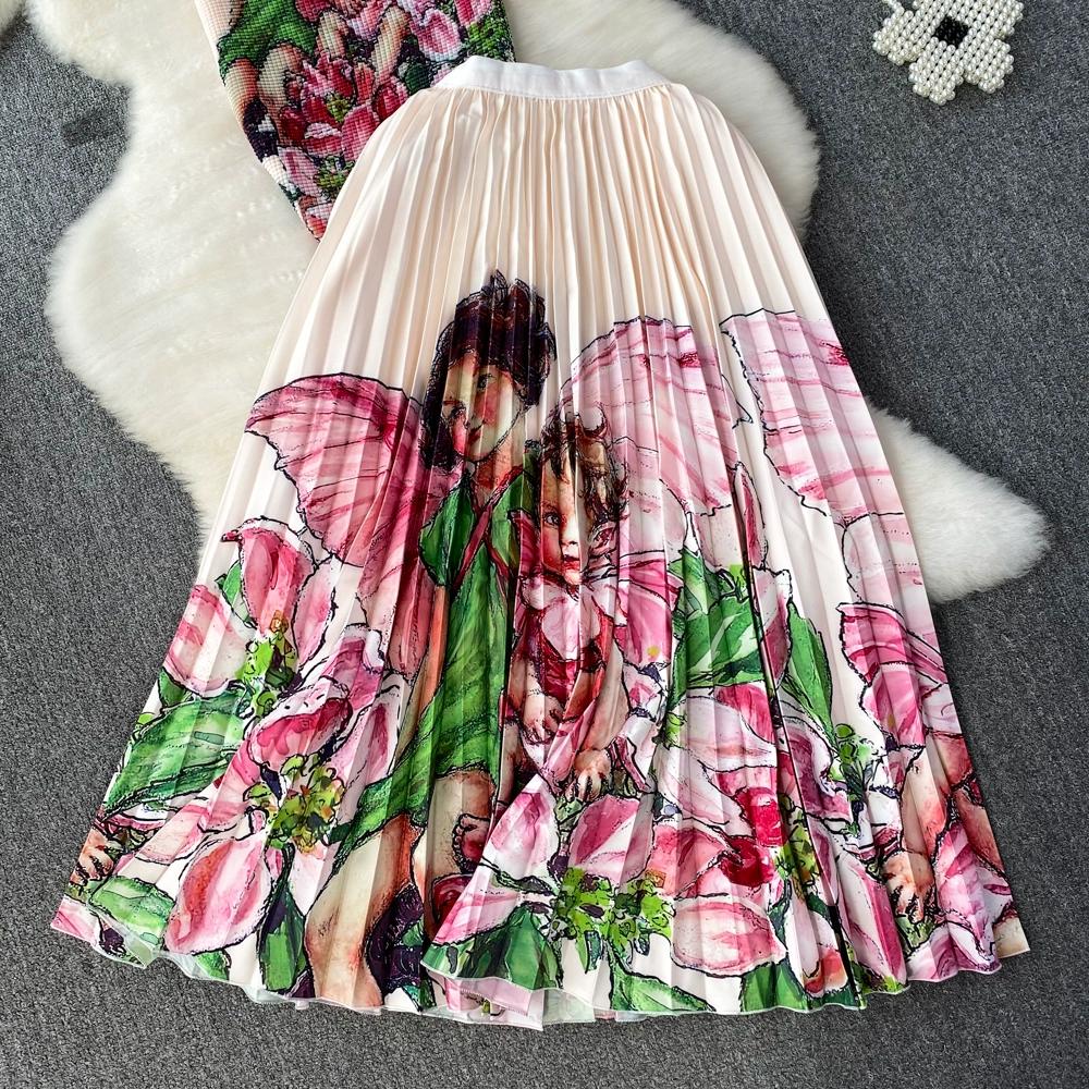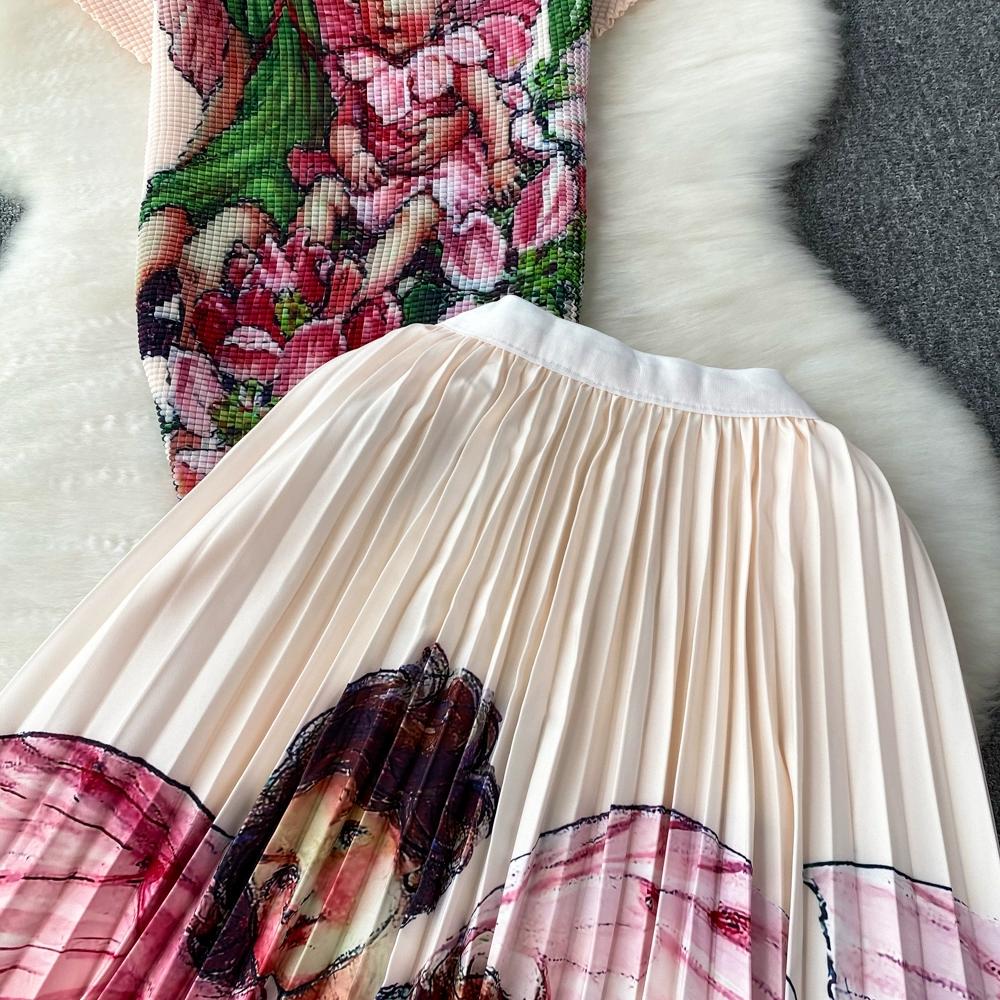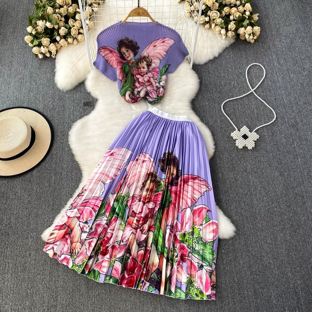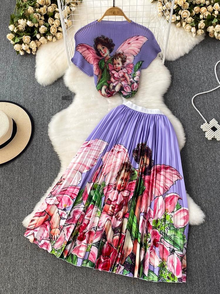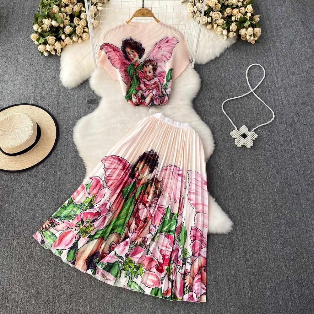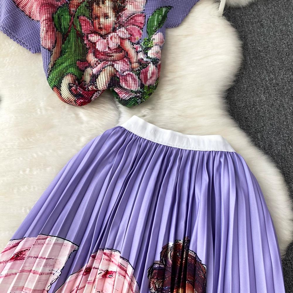 Новый летний женский брендовый дизайнерский комплект с эластичной складкой и принтом из двух предметов, модная верхняя блузка с короткими рукавами и длинная плиссированная юбка-миди, наряды
