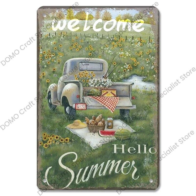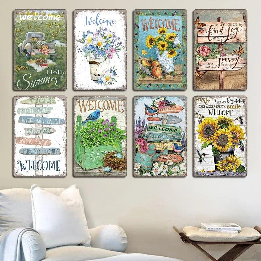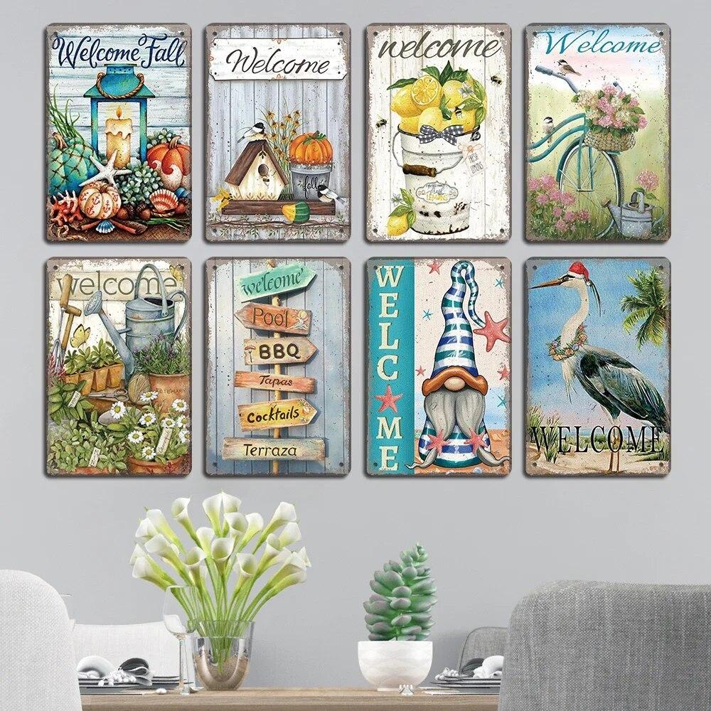 Винтажный приветственный плакат, металлические жестяные знаки, цветы, птицы, автомобиль, металлическая доска, настенный декор для кафе, дома, сада, фермы, пляжной хижины