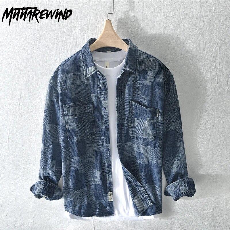 Новая джинсовая рубашка с длинным рукавом, мужская уличная одежда, трендовые джинсовые мужские топы, жаккардовые рубашки в клетку контрастного цвета, молодежная мужская одежда, повседневная свободная рубашка 4XL