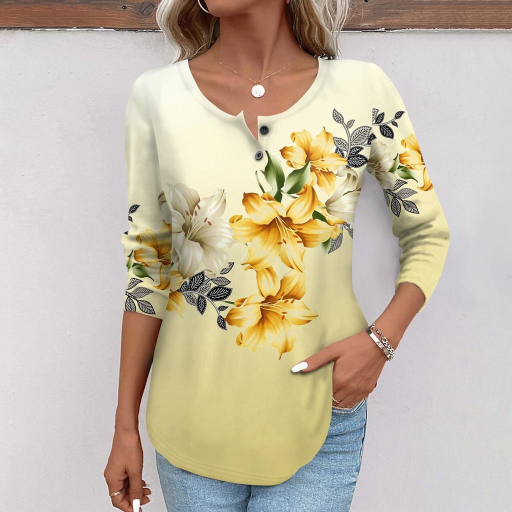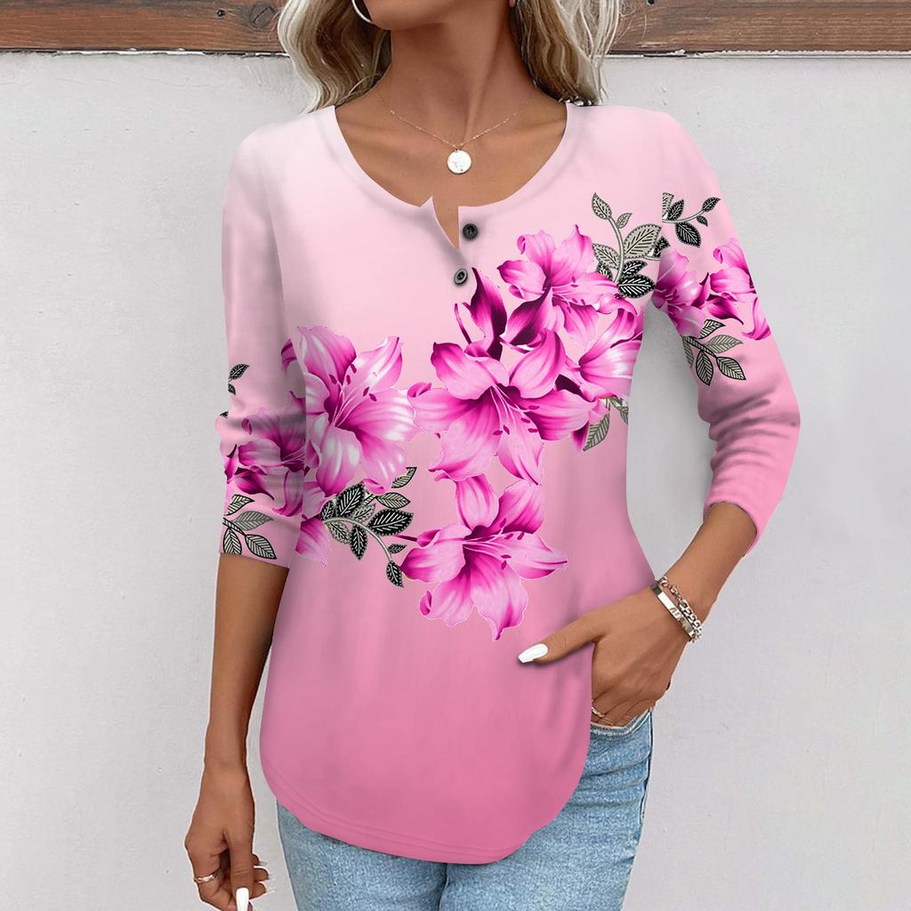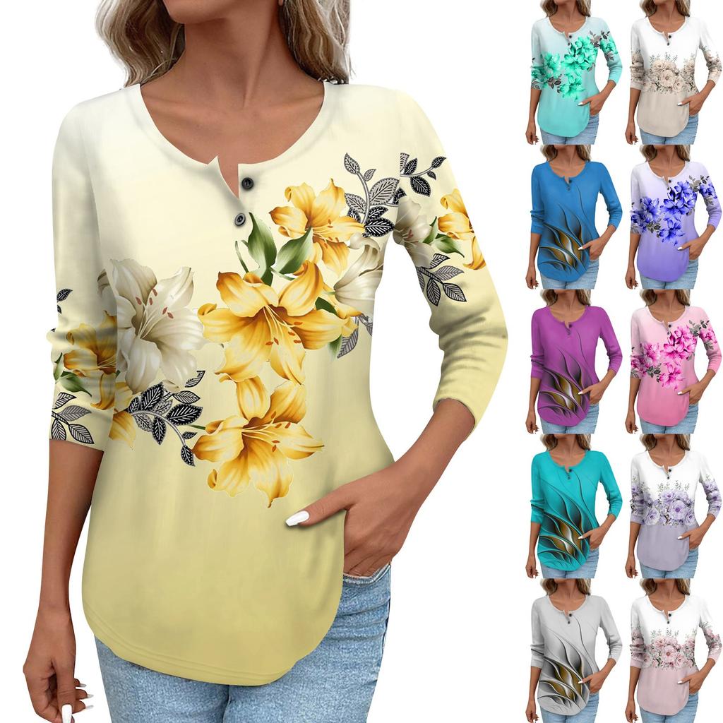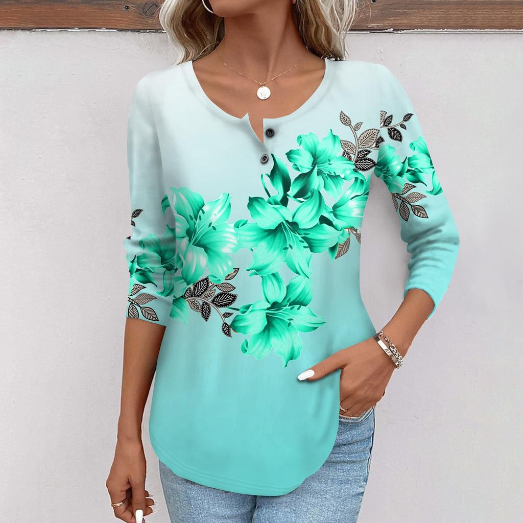 Женская мода повседневный топ на пуговицах с длинным рукавом с цветочным принтом и круглым вырезом