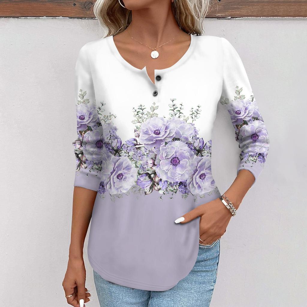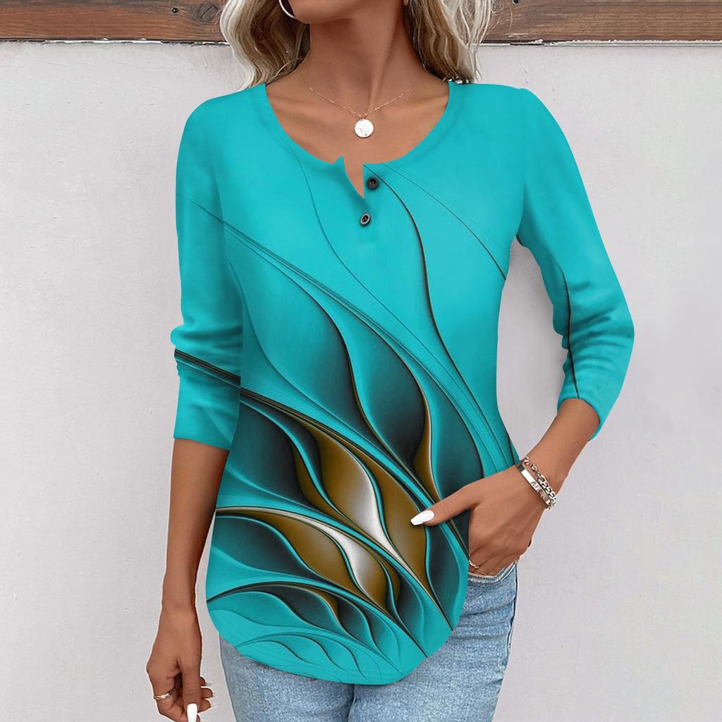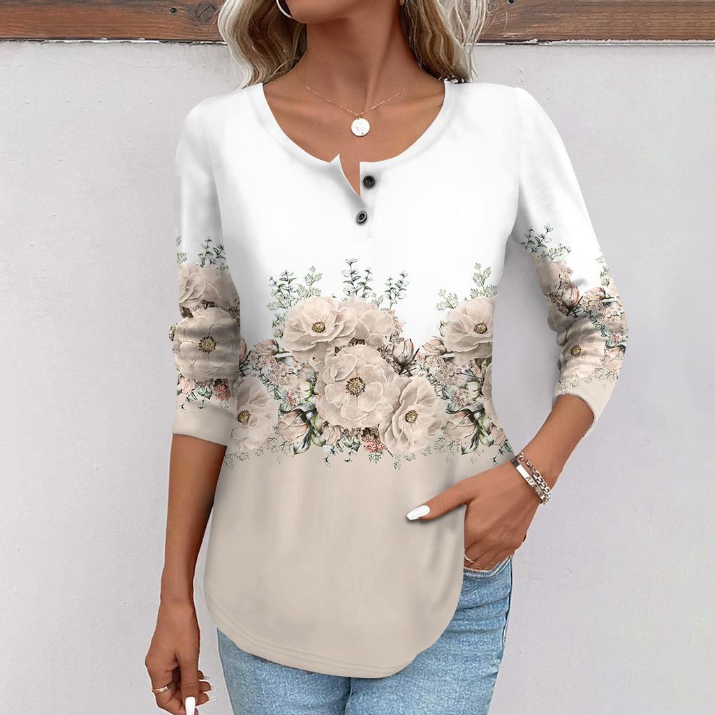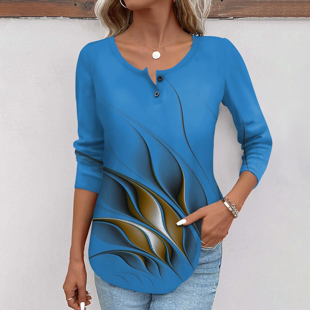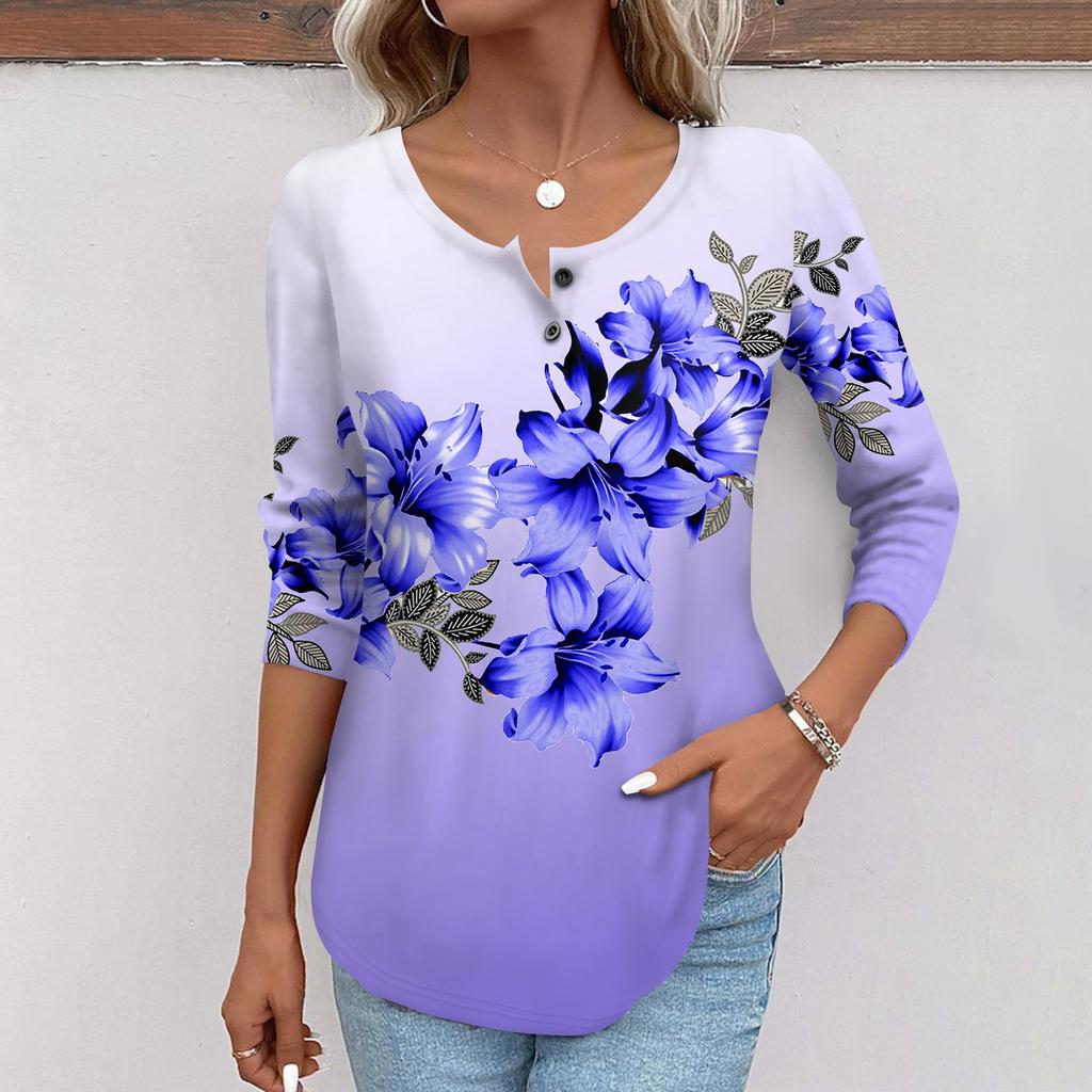 Женская мода повседневный топ на пуговицах с длинным рукавом с цветочным принтом и круглым вырезом