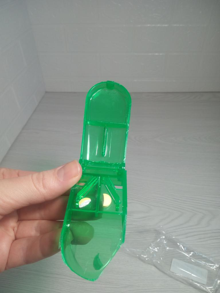 Коробочка из прозрачного твердого пластика, закрывается плотно, есть отсек для хранения нарезанных таблеток и можно не бояться, что они рассыпятся, нож очень острый, режет отлично. Таблетка хорошо держится на месте, поэтому режется ровно. У меня уже имелось подобное приспособление, есть с чем сравнить. Эта выполняет свои функции на 5+. А если учесть цену, то можно и 10+ поставить 👍