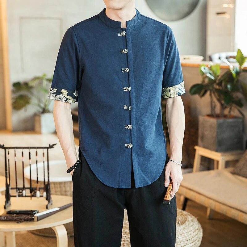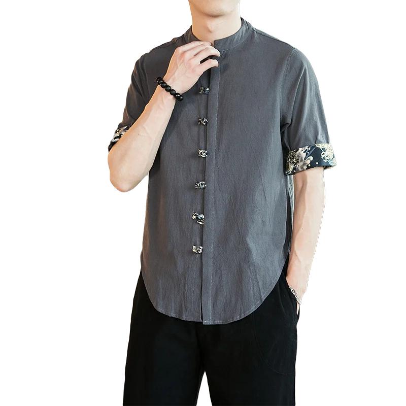 Рубашка среднего размера из хлопка и льна в китайском стиле с пуговицами и рубашка соответствующего цвета для мужчин