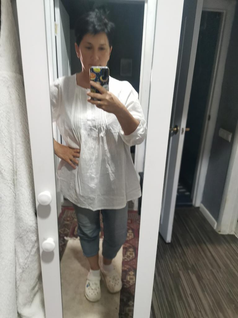 Блузка неплохая, пошита аккуратно, тонкий 100 %-й хлопок. Но...., крой немного неудачный. На ОГ 116 см мала! Рукава узковаты и короткие. А в области над грудью, расстояние между проймами вообще не позволяет застегнуть пуговицы. Можно конечно распустить по паре застрочек с каждой стороны, но думаю, что это не очень то и поможет. Также, нужно учесть, что блузка после стирки точно подсядет. Возможно, блузка этого размера хорошо сядет на более миниатюрную фигуру с не больше 50-го размера.