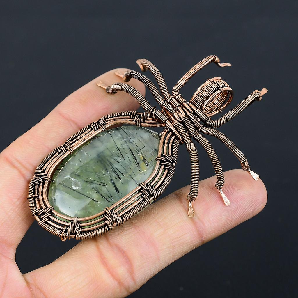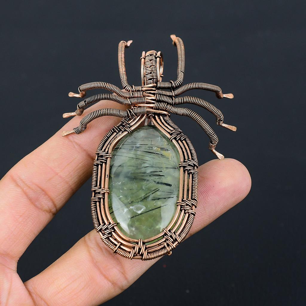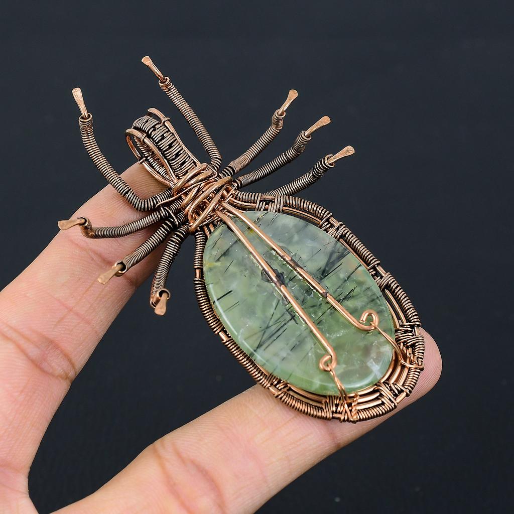 Натуральный моховой пренит Камень Ручная работа Медная проволока Оплетка Кулон Паук 2.56" O6E95