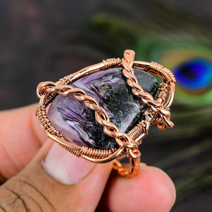 Подарочное кольцо из медной проволоки с натуральным русским чароитом, размер 7,5 R4b61