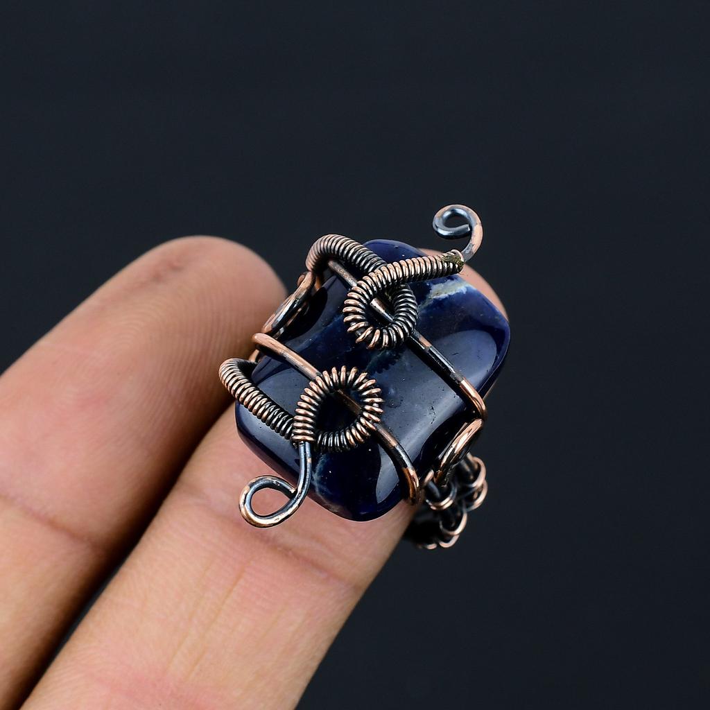 Подарочное кольцо ручной работы из медной проволоки с натуральным драгоценным камнем содалитом, размер 9 f2M24
