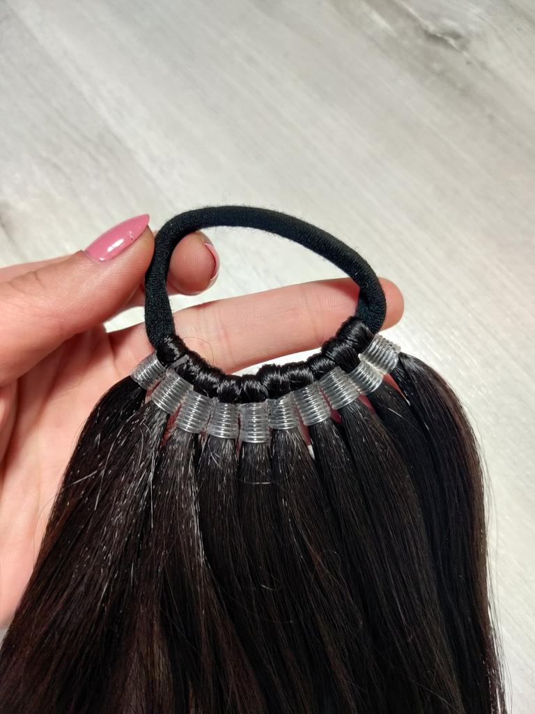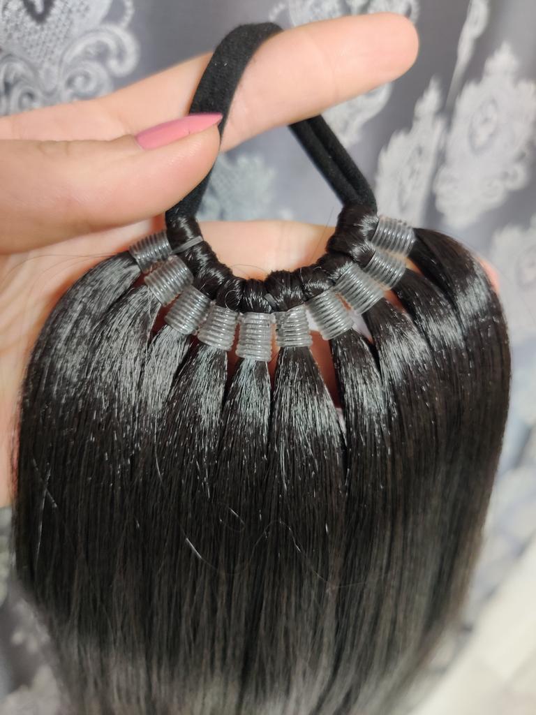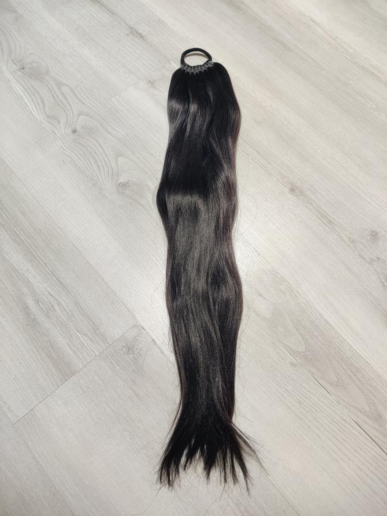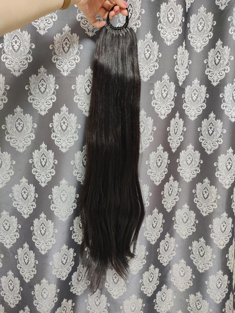 Накладной хвост на резинке Это термо волосы их можно крутить на плойку и выравнивать утюжком Сам хвост немного прогафрирован для объема Неприятного запаха нет, волосы не лезут Длинна 65см Хвост идёт на резинке и завязывается на свои волосы Рекомендую!
