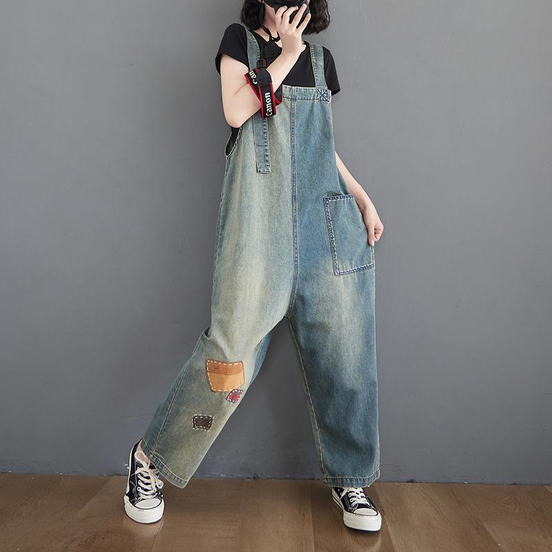 Свободные комбинезоны больших размеров, женские комбинезоны, весенние повседневные джинсовые комбинезоны на бретелях, винтажные джинсовые брюки с нашивками, мешковатые комбинезоны