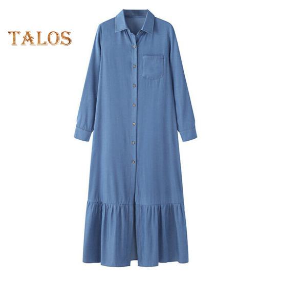 Ощутите простоту и элегантность в однотонном дизайне этого женского платья.. Это платье-рубашка с воротником с лацканами, длинными рукавами и однобортной застежкой излучает изысканность, сохраняя при этом непринужденную атмосферу.
