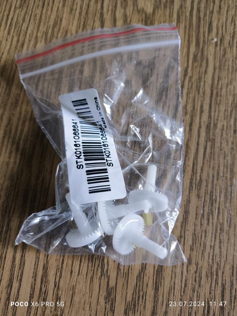 Маленькая шестерня имеет размер больше чем вал двигателя. Вал 0.8 мм , значит шестерня имеет 1 мм. У большой шестерни зубья немного выше чем у старой, поэтому зацепление хорошее даже со старой маленькой шестерней на валу моторчика. Модуль старых и новых шестерен совпадает.