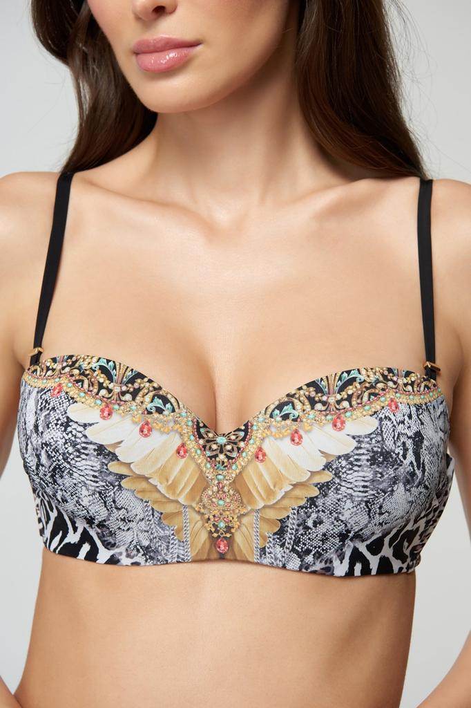 Выпустите свою хищную сторону на волю с новой серией купальников "WILD BEAUTY"! Купальник с чувственным принтом, который позволит вам в полной мере раскрыть своё внутреннее «я». Не бойтесь показаться слишком дерзкой. Сочетание акцентных принтов и наших классических моделей создает одновременно сильный и модный образ. Верх купальника бандо с формованными чашками на косточках. Съемные вкладыши пуш-ап. Съемные бретели регулируются по длине. На спине застежка. Спереди эксклюзивный принт.