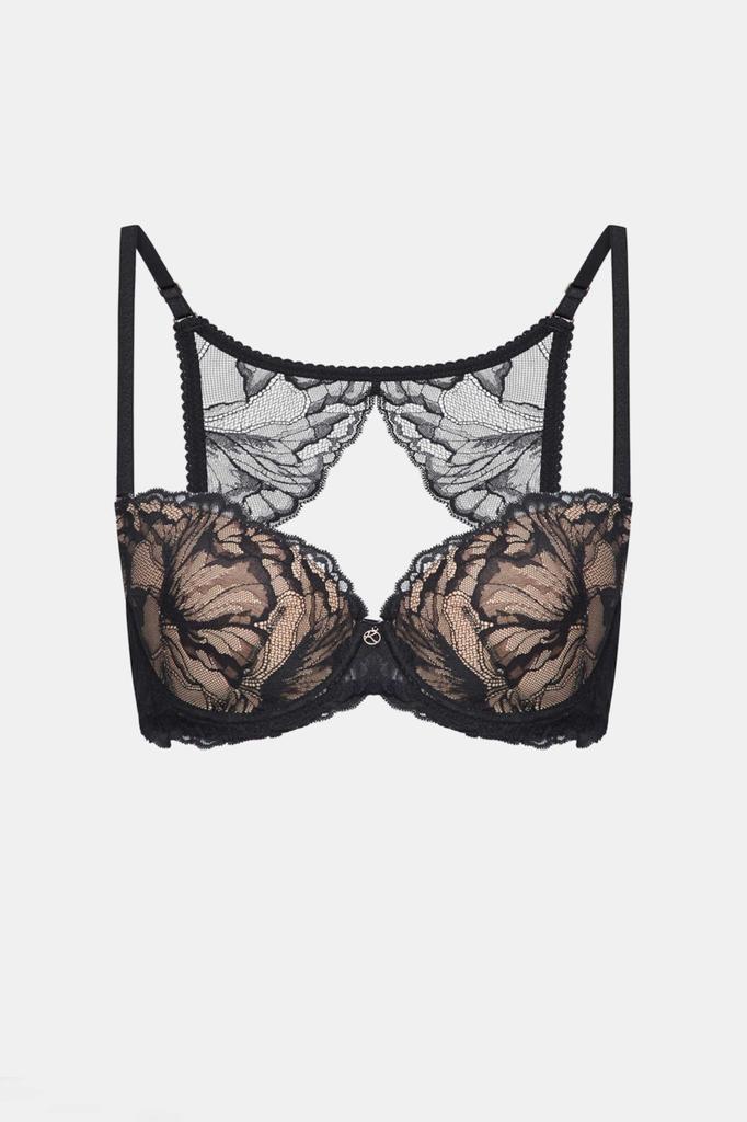Чашки украшены роскошным итальянским кружевом черного цвета, в сочетании с сетчатым полотном. Вместе они образуют выразительный узор, напоминающий цветочную композицию.
