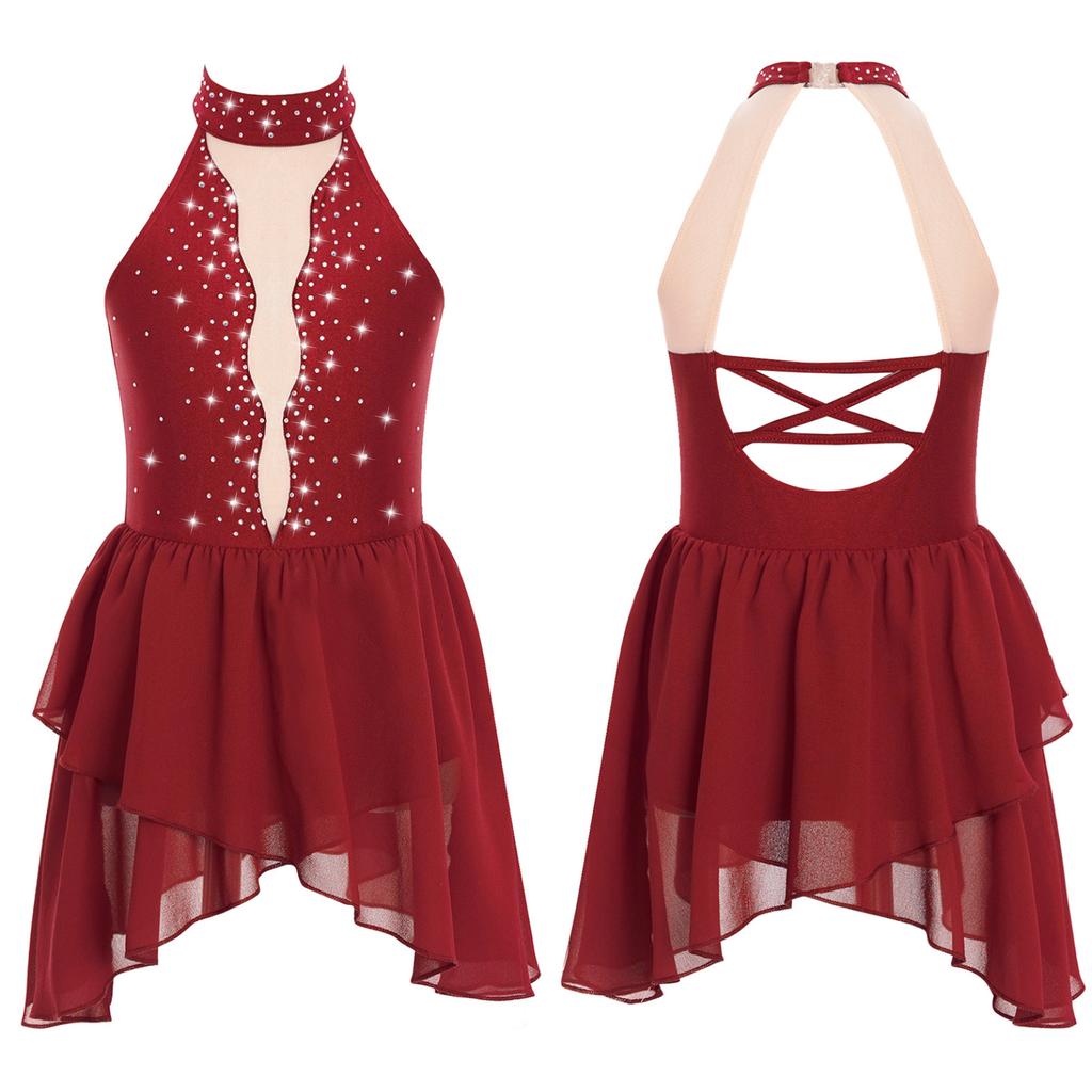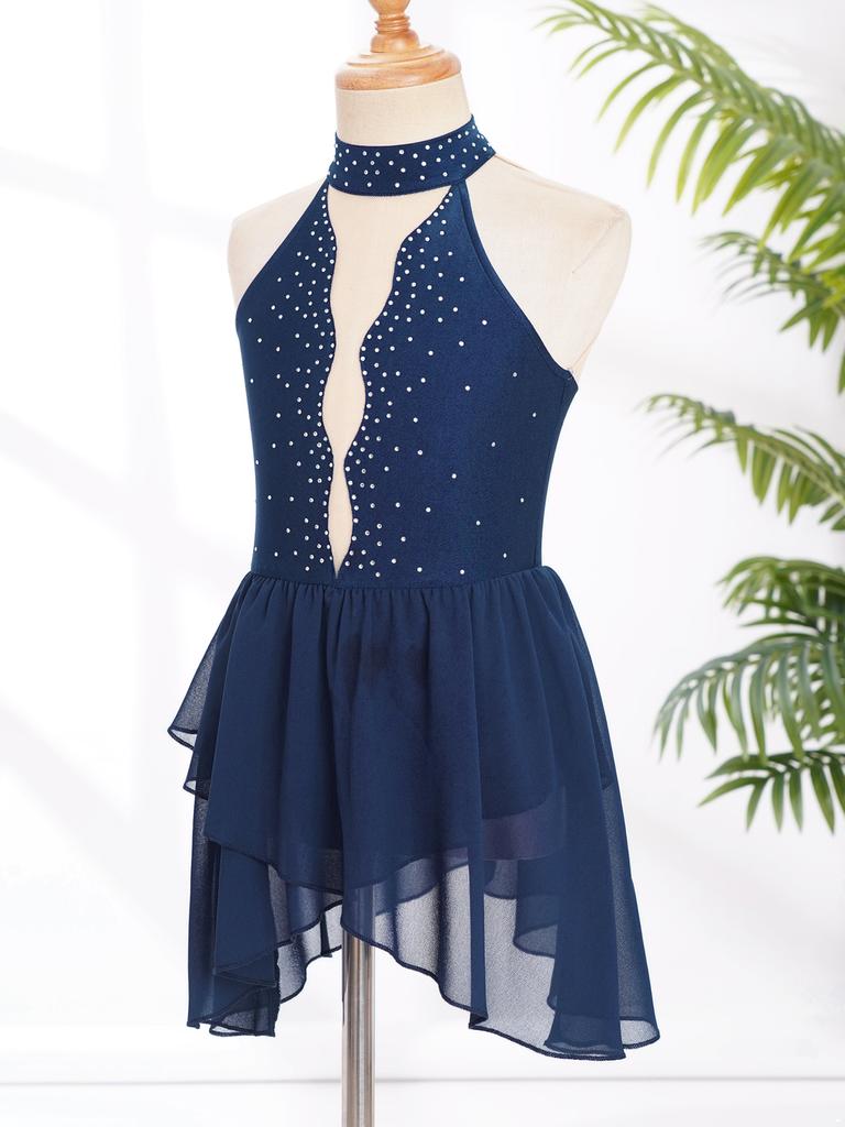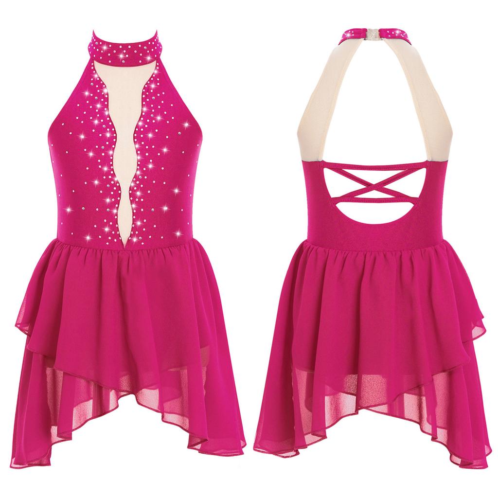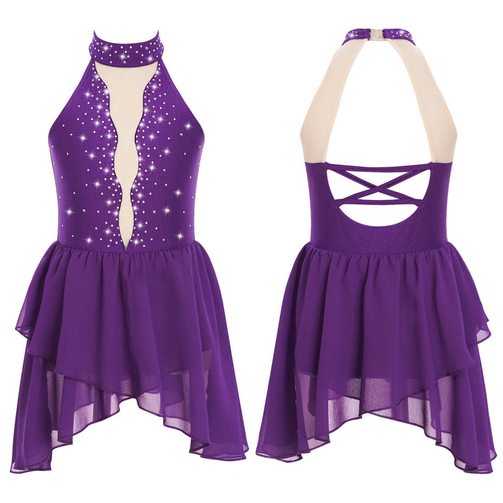 Детское балетное платье для лирических танцев для девочек, костюм для фигурного катания со стразами, прозрачный сетчатый гимнастический трико без рукавов, танцевальная одежда