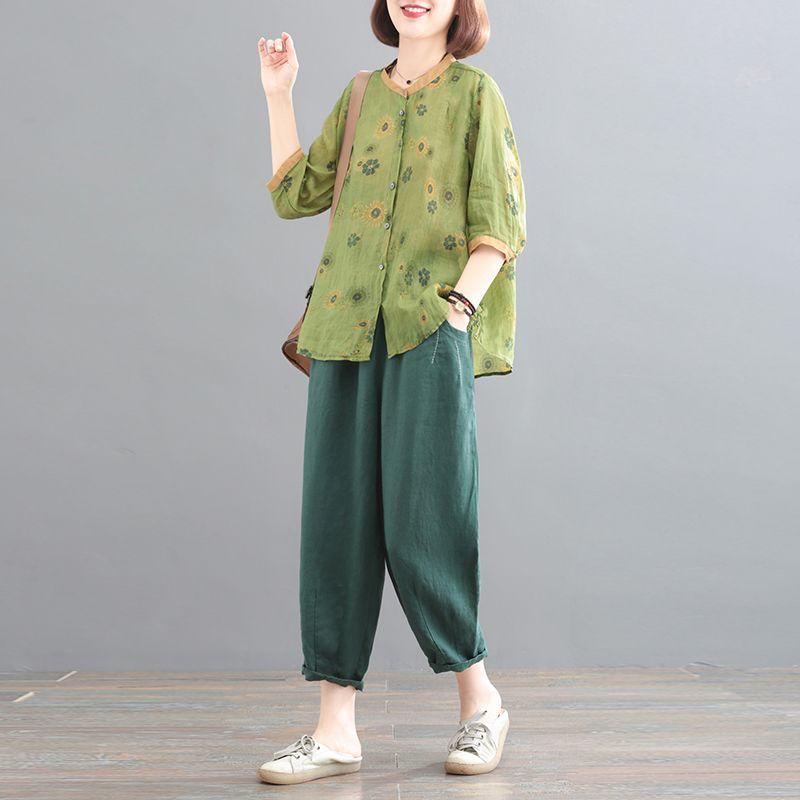 Тонкий печатный литературный ретро-модный модный летний костюм из двух частей Ramie для женщин