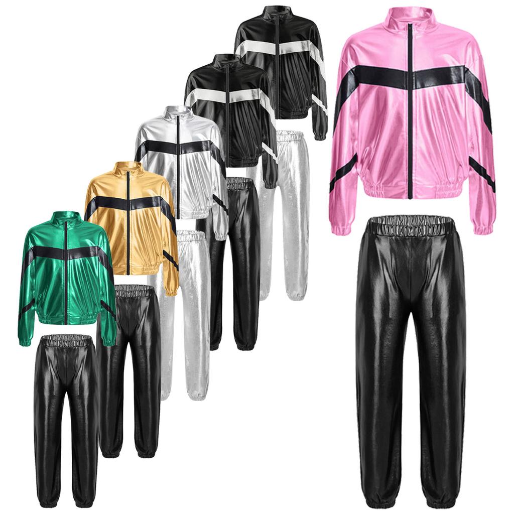 Детская куртка с металлизированным воротником-стойкой и длинными рукавами для девочек на молнии спереди и брюки с эластичной резинкой на талии для танцевальных выступлений в стиле хип-хоп — купить товар онлайн с бесплатной доставкой до всему миру!