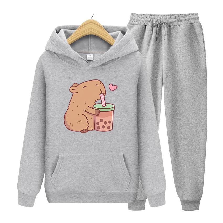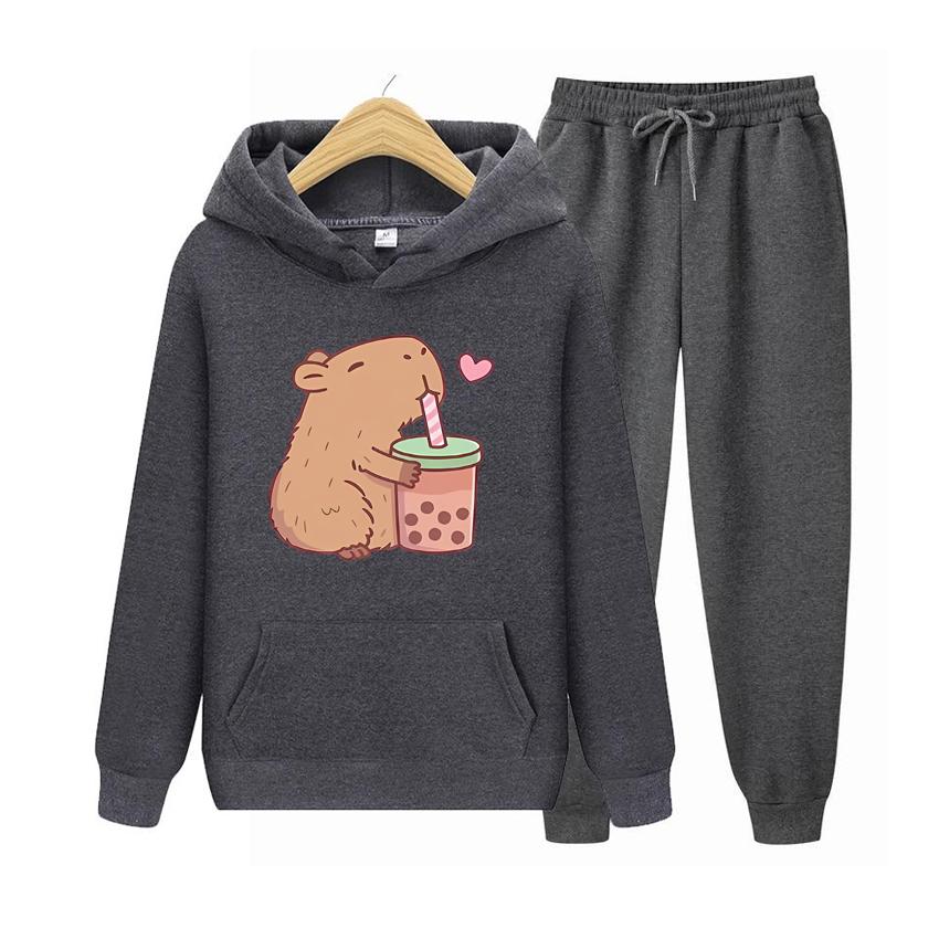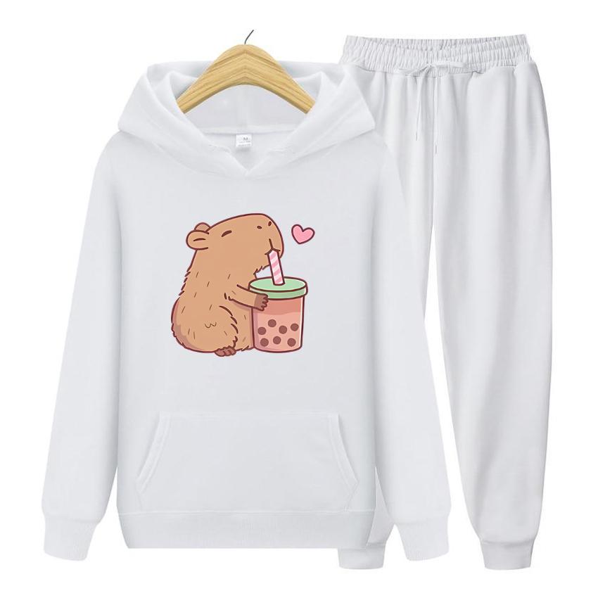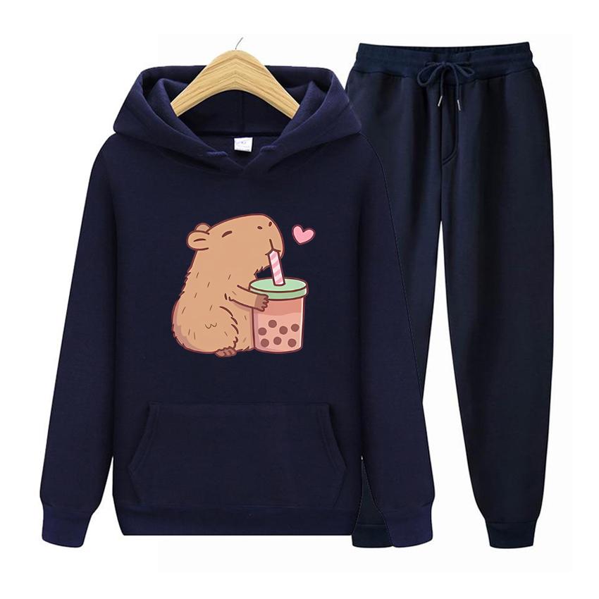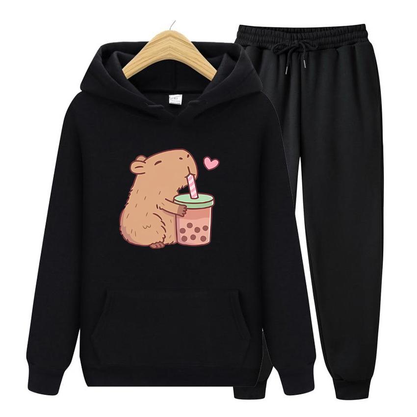 Мужской спортивный костюм Kawaii Bubble Tea Толстовка с капибарой для женщин и мужчин Эстетичный графический комплект с капюшоном Унисекс Пуловеры в стиле Харадзюку Толстовки