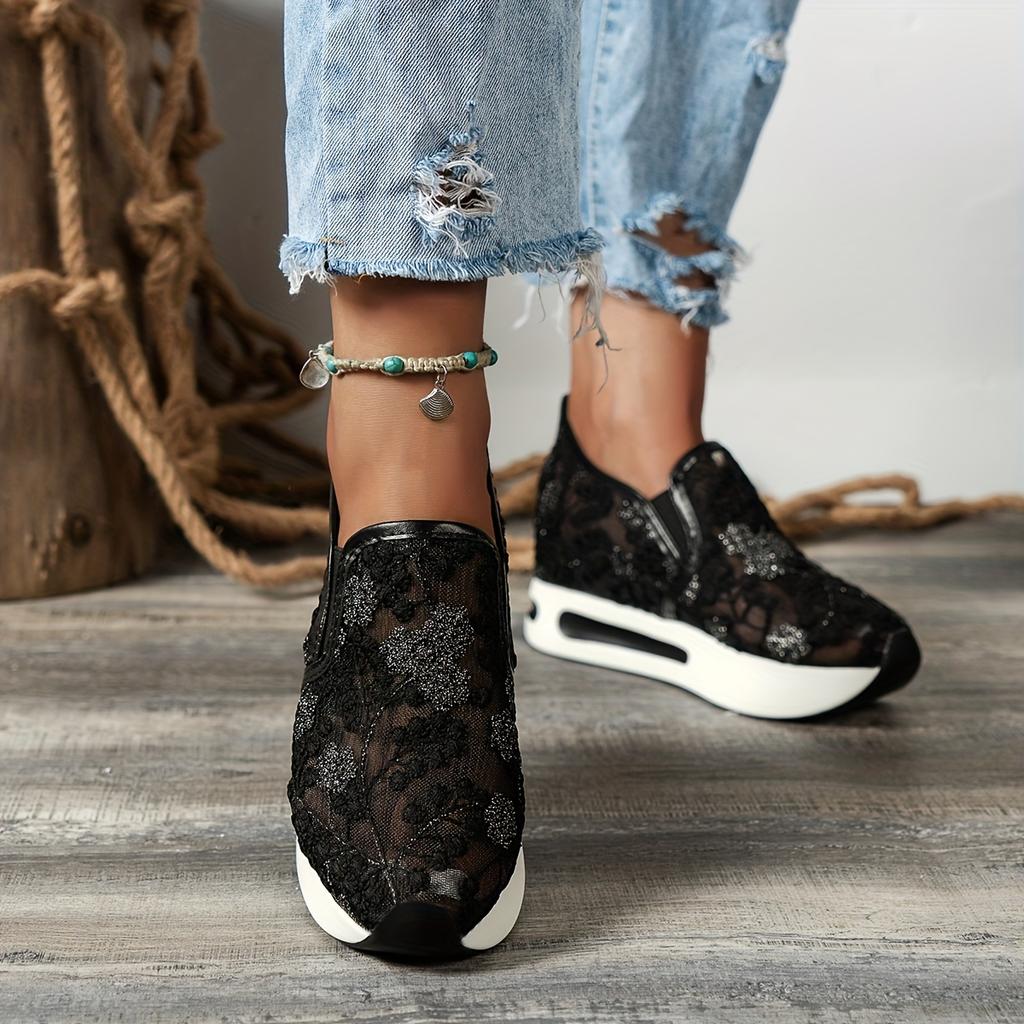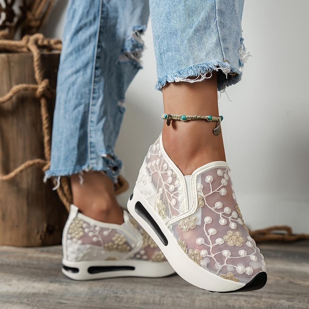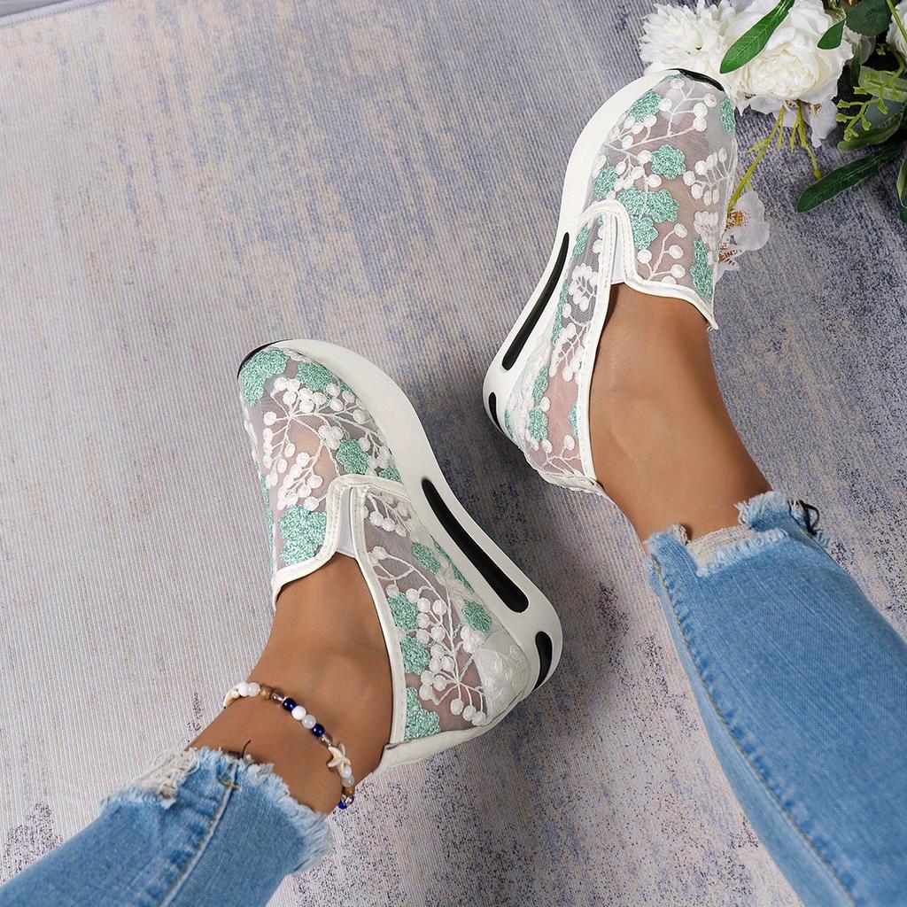 Женские кроссовки из кружевной сетки, модные кроссовки на платформе с цветочным узором, женская противоскользящая обувь без шнуровки
