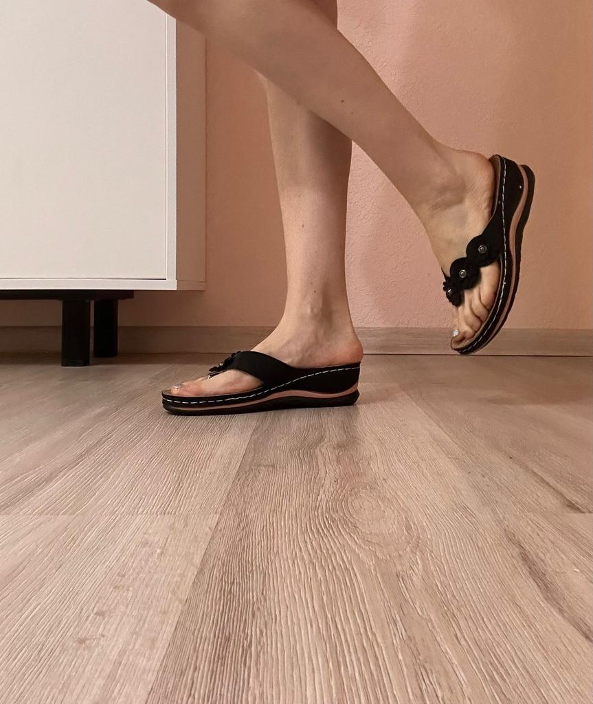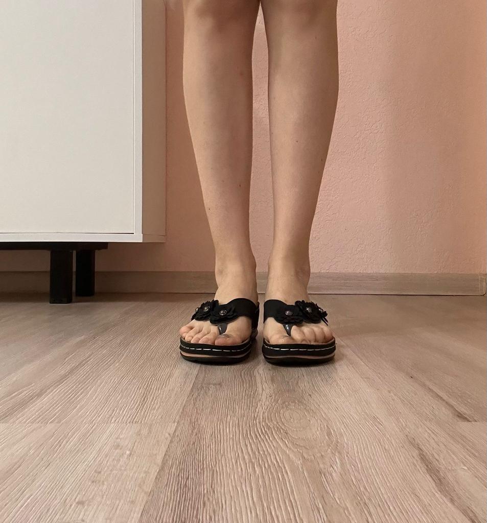 Ожидала лучшего. На длину стопы 26.2 размер 43 как раз. Шлепки на широкую ногу, моя нормальная - не широкая и не узкая - и мне они широковаты, см. фото. Деффектов не наблюдаю, строчки все ровные, аккуратные, не тяжелые. В целом норм, но я без особого восторга.
