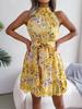 Весна-лето женское короткое платье трапециевидной формы без рукавов с лямкой на шее и лямкой на шнуровке с цветочным принтом