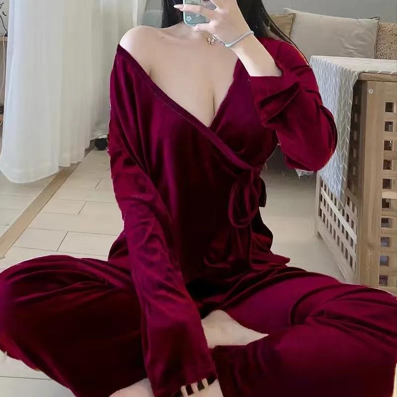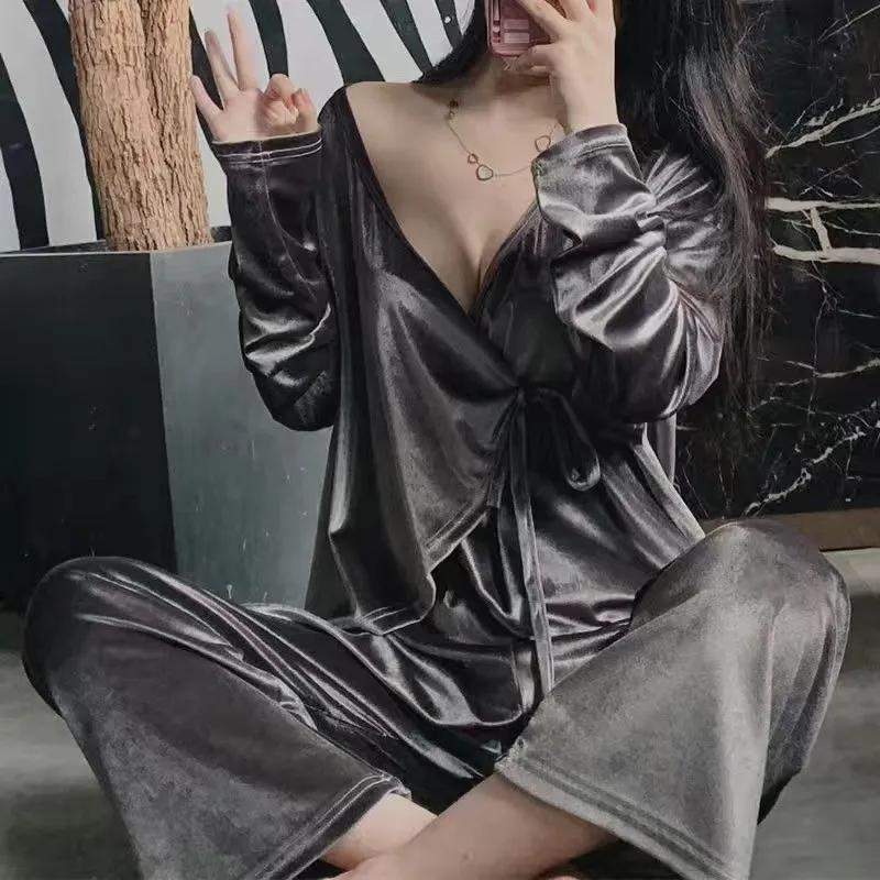 Женский сексуальный золотой бархатный пижамный комплект с v-образным вырезом, японское кимоно, домашняя одежда, весенние однотонные пижамы с длинными рукавами, комплект из двух предметов, спальный костюм