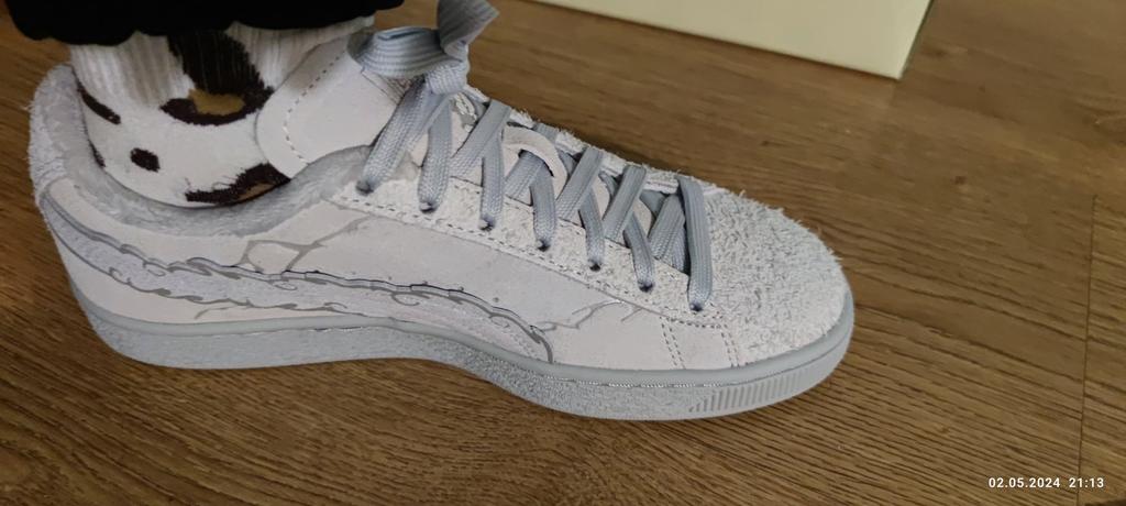 С обувью все в порядке, я не спец, но вроде оригинал, но, и это очень важно: нет фиолетовых комплектных шнурков, нет брендированной бумаги PUMA X One Piece, в которую должны быть завернуты кроссовки (они завернуты в обычную, но там должно быть 2 бумаги: обычная и брендированная) и нету наклеек на стельках. Сейчас написал в поддержку по поводу шнурков, если не решат эту проблему, то напишу, а пока жду. P.S. Это пара для внутреннего рынка из Китая, поэтому тут нет фиолетовых шнурков (ответ поддержки). Вообще о таких вещах надо заранее писать, но цитата: нигде не написано, что они входят в комплект. Ну, если кратко, то я доволен, но это косяк как ни посмотри