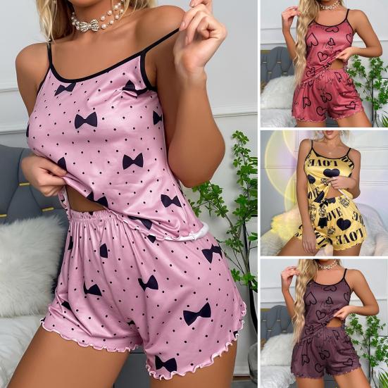 Женский пижамный комплект из 2 шт./компл. с принтом в виде сердца и гофрированными гофрированными бретельками без рукавов с эластичной резинкой на талии, мягкий шелковистый комплект домашней одежды с верхом и шортами — купить товар онлайн с бесплатной доставкой до всему миру!