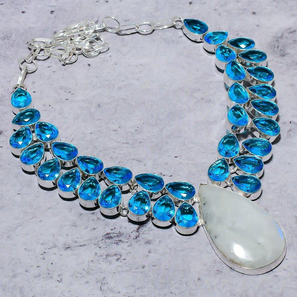 Ожерелье из стерлингового серебра 925 пробы с натуральным радужным лунным камнем и голубым топазом 18 дюймов m2U02