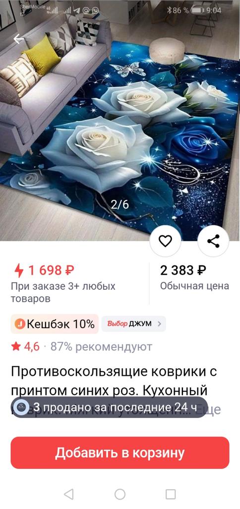 Получила дорожку в спальню (ранее получила такого же цвета прикроватный коврик), очень приятные ощущения для ног, эти изделия такие мягкие, так и хочется на них стоять. Может быть, немного тонковаты, но они мне очень нравятся, и эти голубые цветы так располагают к спокойствию и уют. Я довольна покупкой. Спасибо продавцу и Джум.