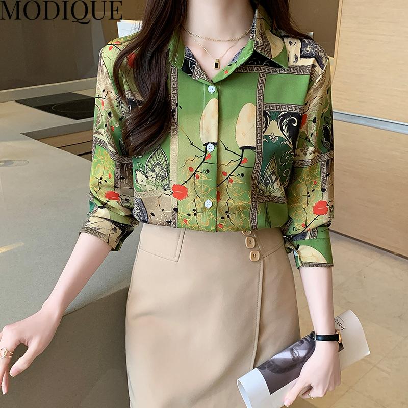 MODIQUE весна лето большие размеры женские свободные элегантные хлопковые шелковые блузки с цветочным принтом рубашки женские модные пальто оверсайз с v-образным вырезом и длинными рукавами