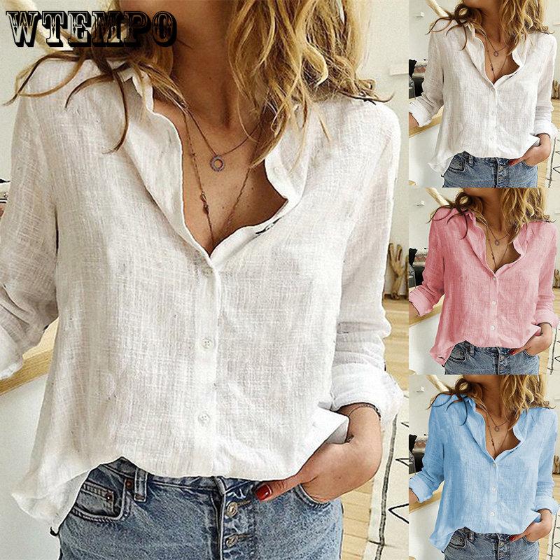 WTEMPO офисные женские однотонные футболки с отложным воротником женские весенние повседневные свободные с длинным рукавом дешевые льняные рубашки на пуговицах — купить товар онлайн с бесплатной доставкой по всему миру!