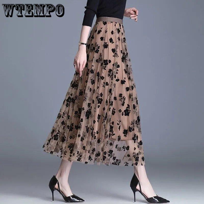 WTEMPO Сетчатые однотонные юбки с цветочным принтом, женские весенне-летние черные длинные газовые юбки, эластичные элегантные пышные юбки с высокой талией