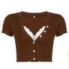 Y2K укороченные топы с кружевной отделкой, коричневая хлопковая футболка на пуговицах с коротким рукавом и v-образным вырезом в стиле ретро, базовая повседневная женская футболка в стиле Харадзюку