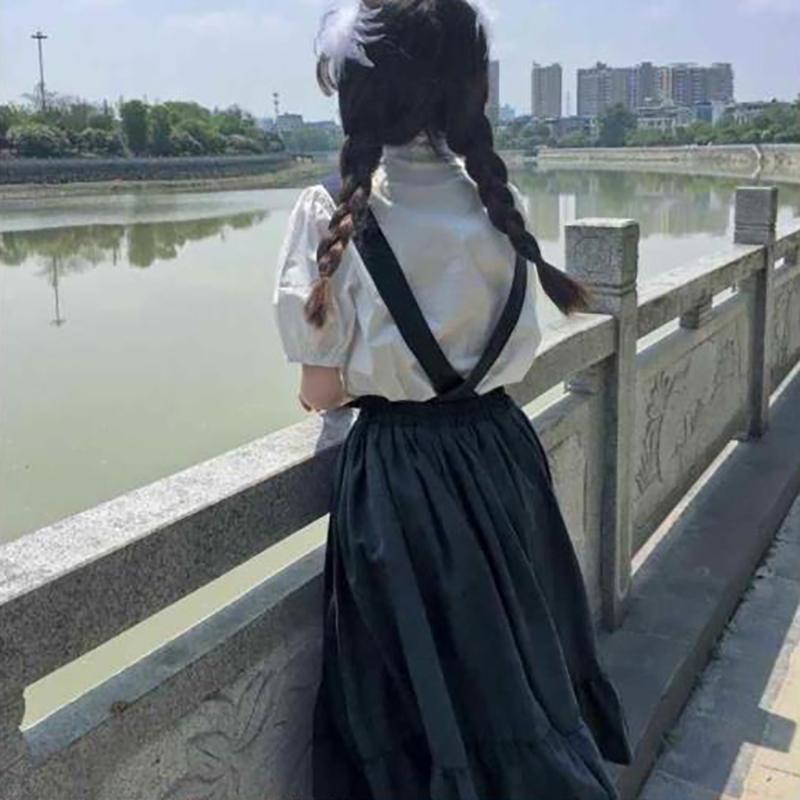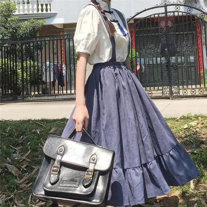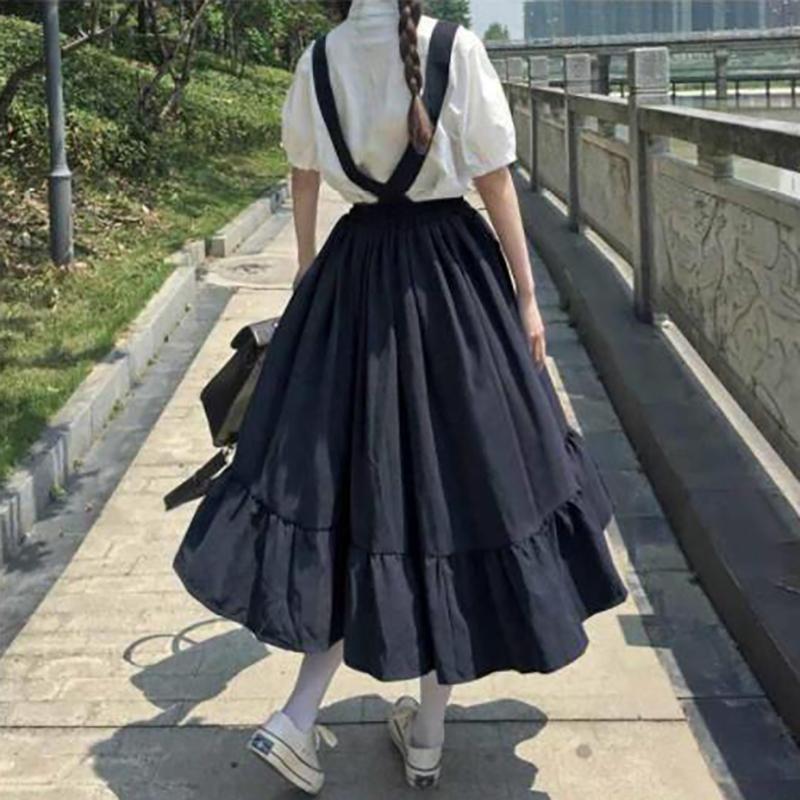 WTEMPO Милые длинные юбки в консервативном стиле для девочек, длинные юбки с оборками, свободные милые студенческие повседневные юбки, женские юбки на подтяжках
