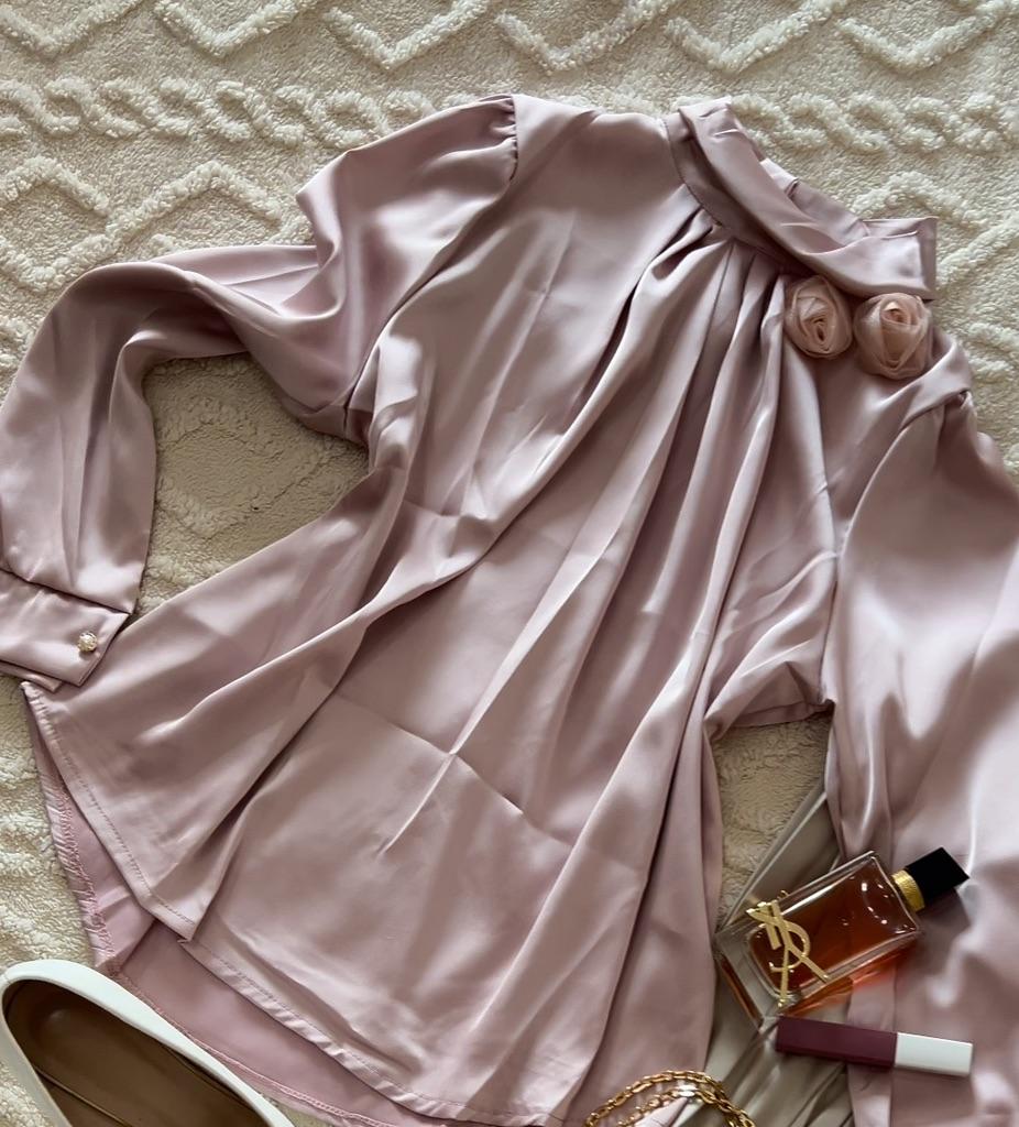 ✅ Атласная блузка в романтичном стиле от WTEMPO. Представлена в трех нежных оттенках, я взяла в розовом. Мои параметры 93-80-106. Размер выбрала L, хотя наверное стоило взять побольше для свободы движения. Хотя блуза села хорошо, рукава не короткие, если носить её заправленной, то вполне комфортно. Блуза имеет воротник-стойку, который застегивается пуговицей сзади. Рукава слегка присборены. У воротника с одной стороны пришиты два бутона розы из органзы. Очень романтично выглядит. Рекомендую! Спасибо продавцу и Джум.