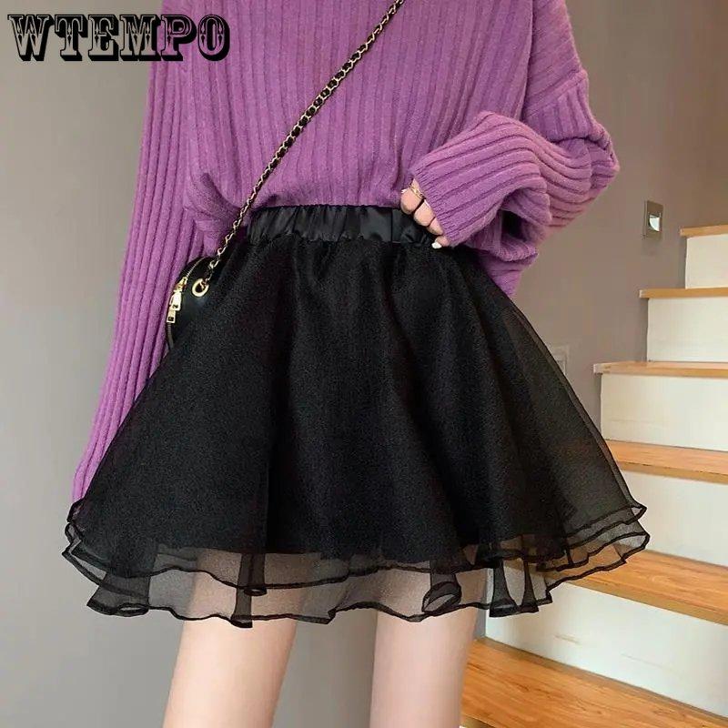 WTEMPO Весенне-летние корейские эластичные мини-юбки-пачки с высокой талией, женские однотонные повседневные сетчатые лоскутные короткие юбки трапециевидной формы