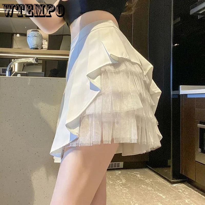 WTEMPO Женские короткие лоскутные газовые юбки с высокой талией, шифоновые тонкие трапециевидные черные, белые повседневные плиссированные мини-юбки