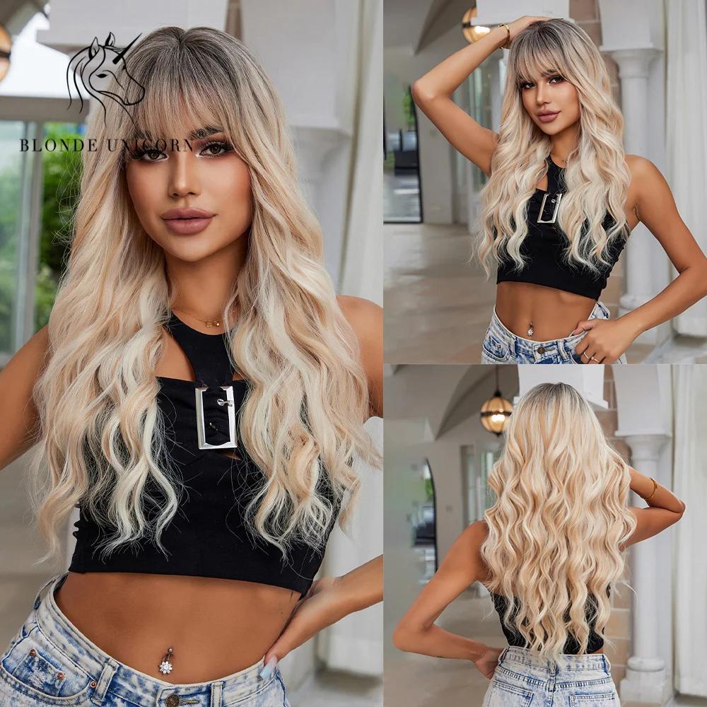 BLONDE UNICORN Ombre Блондинка Коричневый Синтетический Парик Длинные Волнистые Парики с Челкой Повседневный Косплей Парик Вечеринки Термостойкое Волокно для Женщин