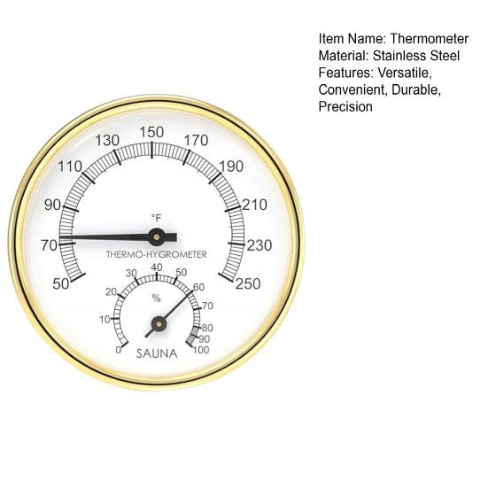 Прочное мастерство: Этот термометр для сауны, изготовленный из высококачественной нержавеющей стали, предназначен для работы в сложных условиях сауны, обеспечивая длительную работу и надежность.