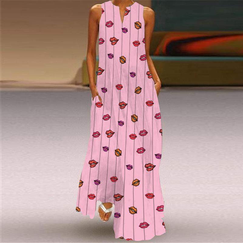 Женское платье А-силуэта Макси, длинные рукава, без рукавов, огненно-красный с принтом губ, осень/зима, v-образный вырез, элегантный стиль в стиле ретро — купить товар онлайн с бесплатной доставкой по всему миру!
