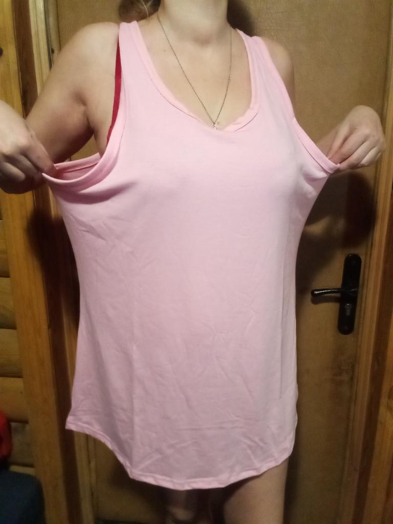 Хорошая, тоненькая, летняя маечка. Ткань просвечивает. Сзади длиннее, чем спереди. Я брала на размер больше потому она на меня немного большая. Просто мне хотелось посвоьоднее. Длинна на 10 см короче описанной при моих замерах.