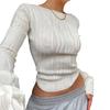 Сплошной цвет женской блузки с круглым вырезом и длинными рукавами, сексуальный обнаженный пупок с рюшами