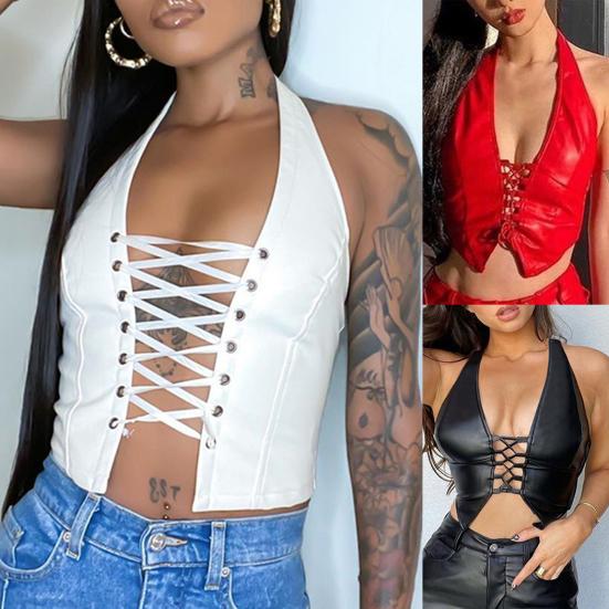Женский жилет с лямкой на шее, сексуальный кардиган на шнуровке, тонкая блузка из искусственной кожи — купить товар онлайн с бесплатной доставкой до всему миру!