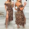 Женское модное платье с коротким рукавом и леопардовым принтом до колена с открытыми плечами