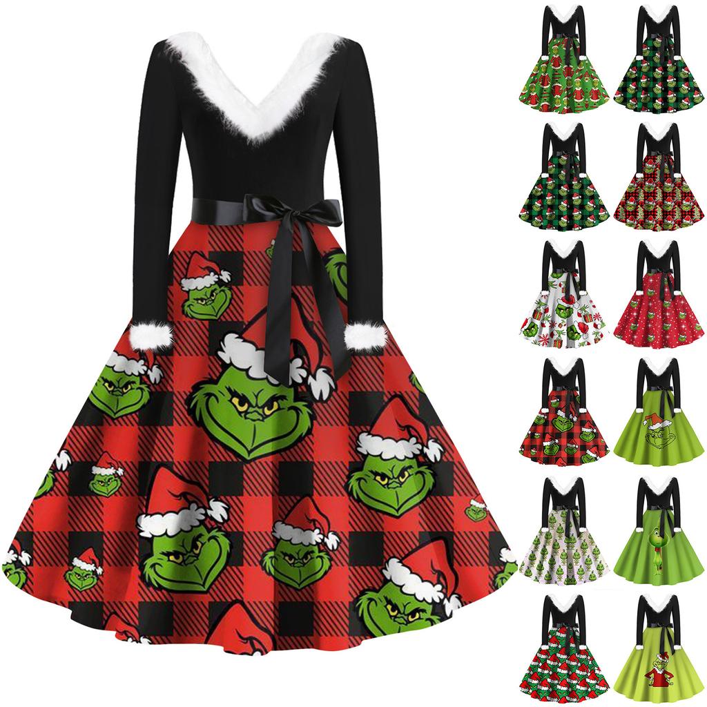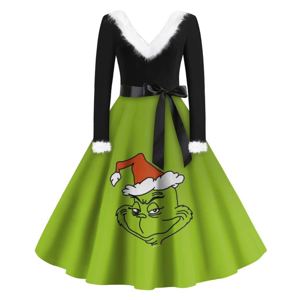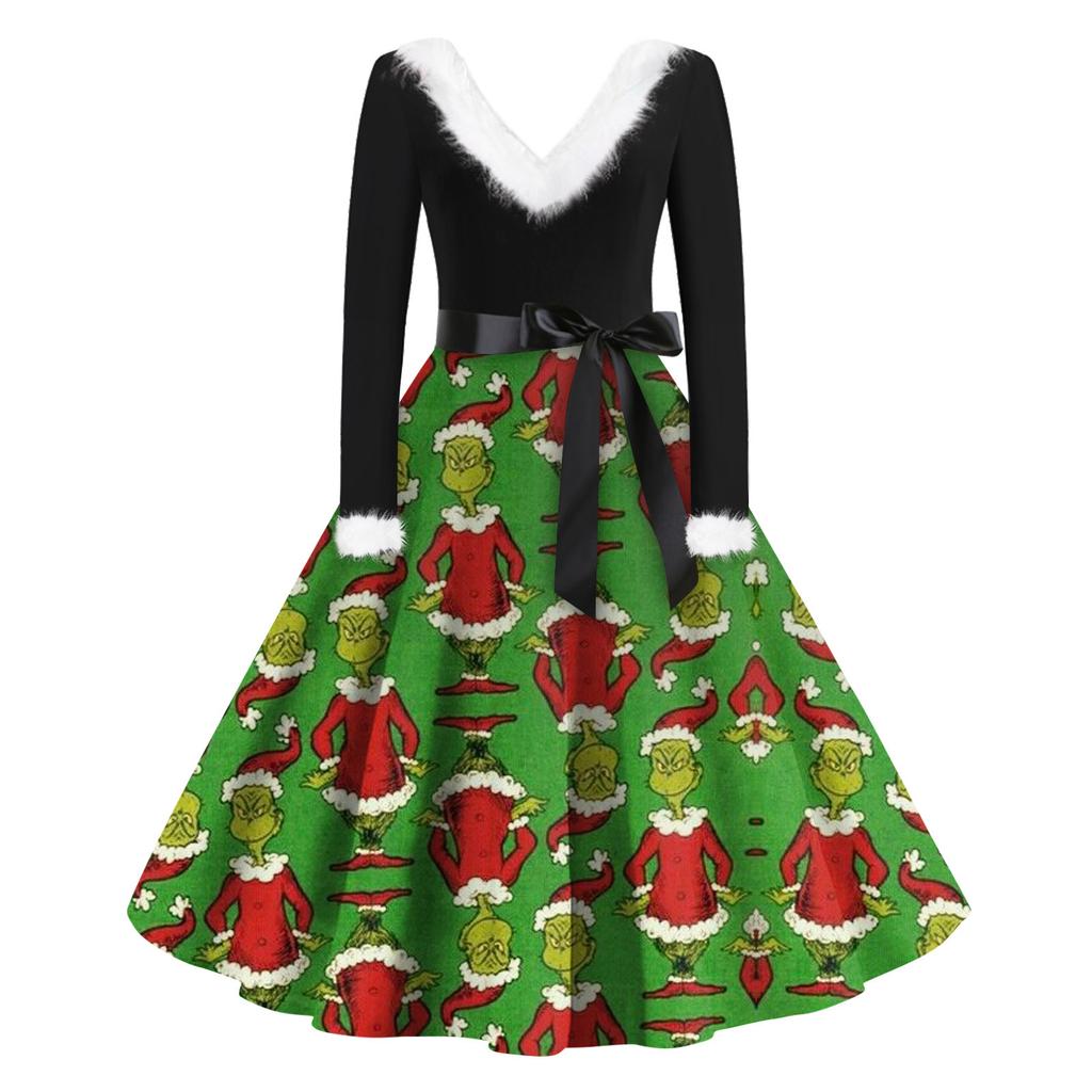 Женская мода с v-образным вырезом, повседневные тонкие рождественские шерстяные платья с длинным рукавом с принтом
