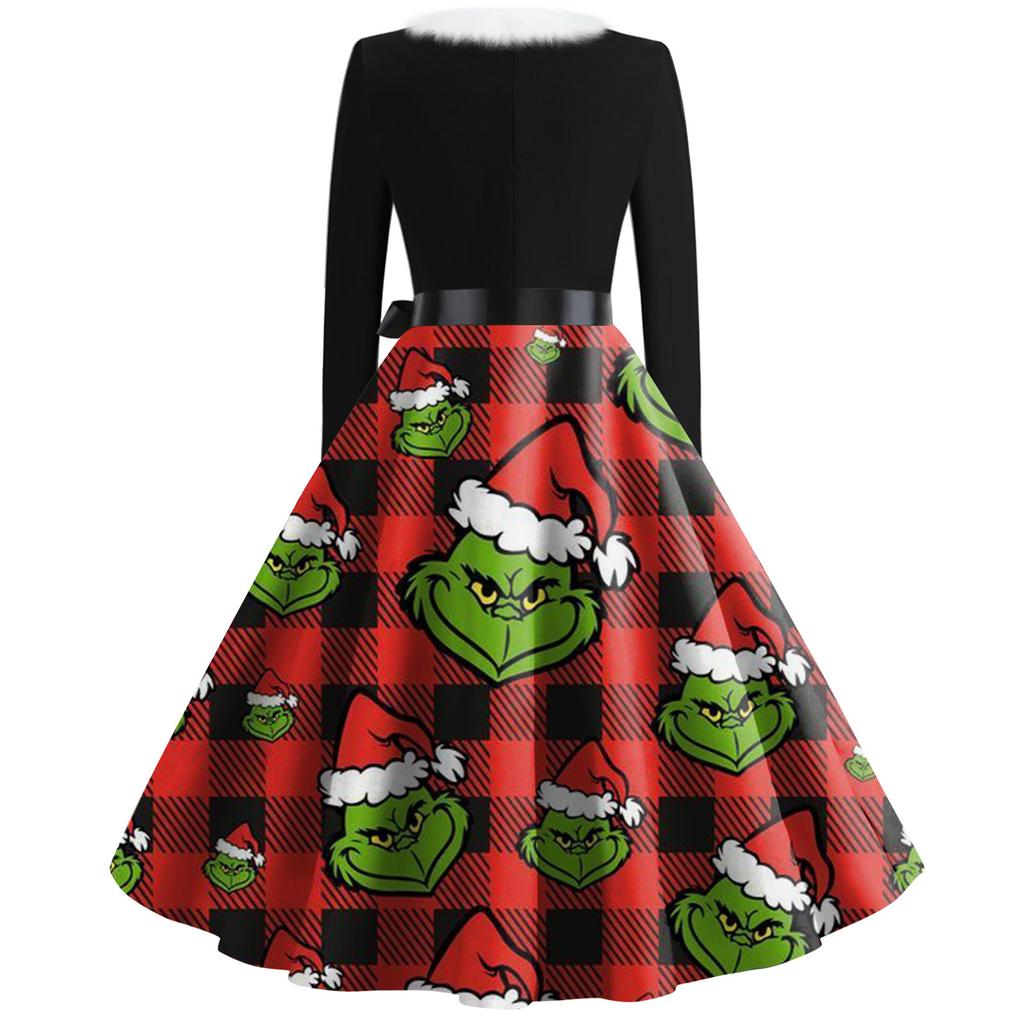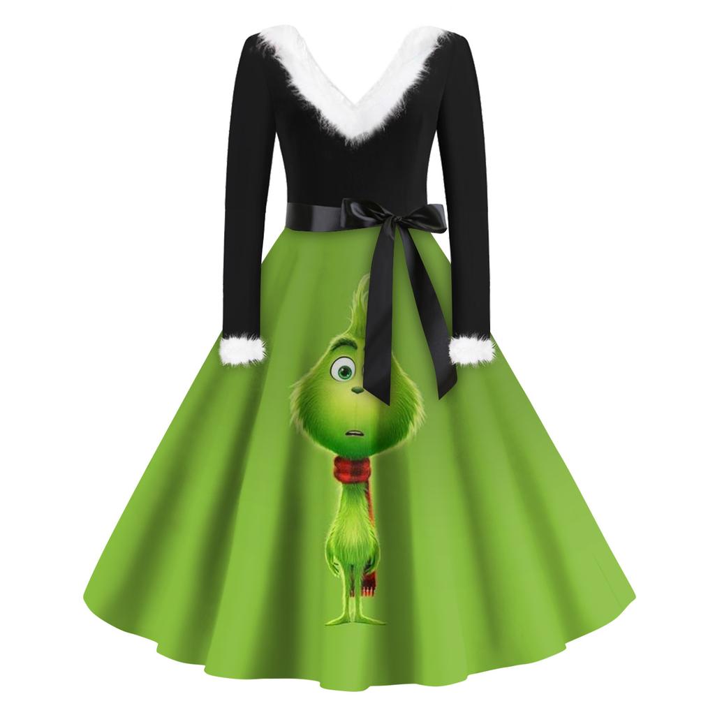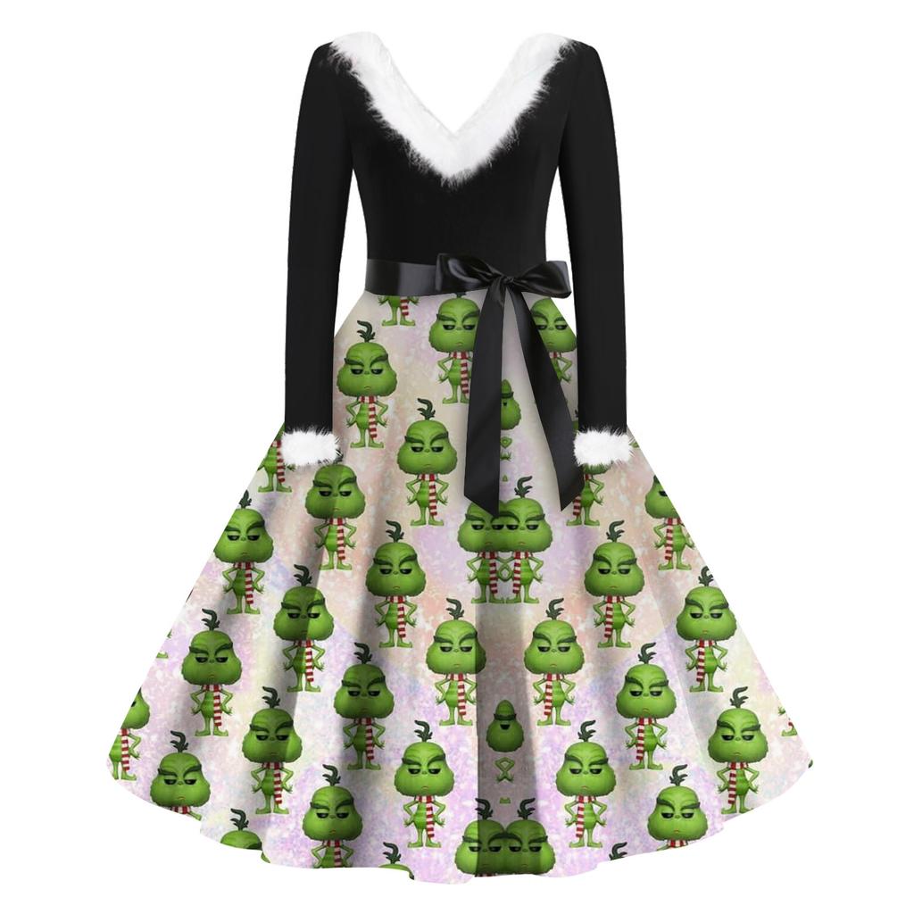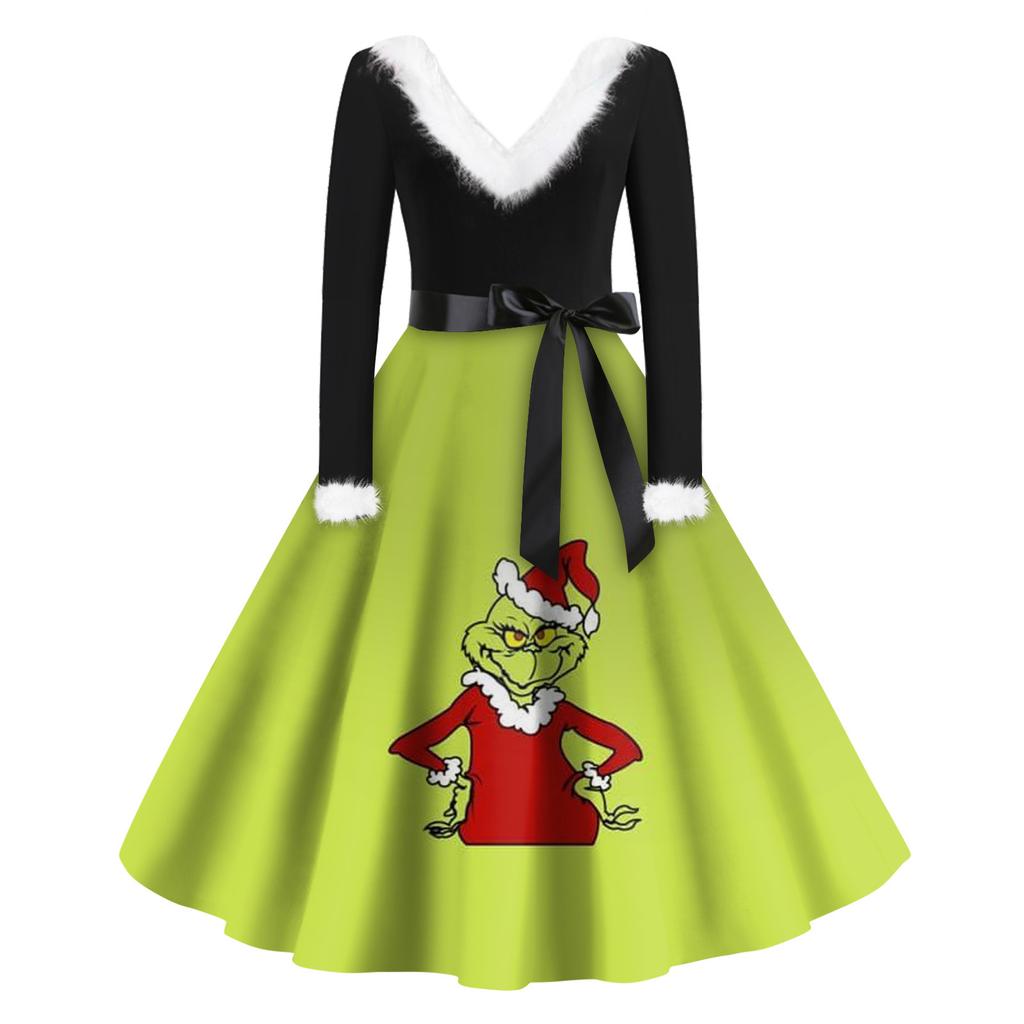 Женская мода с v-образным вырезом, повседневные тонкие рождественские шерстяные платья с длинным рукавом с принтом