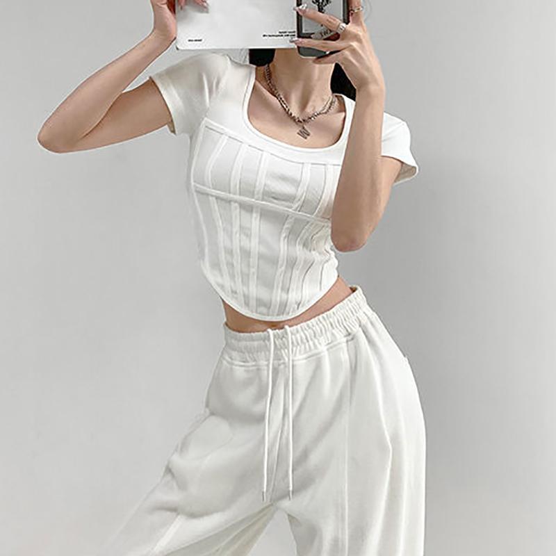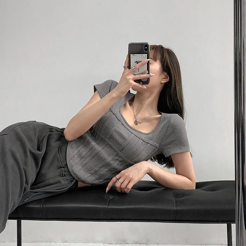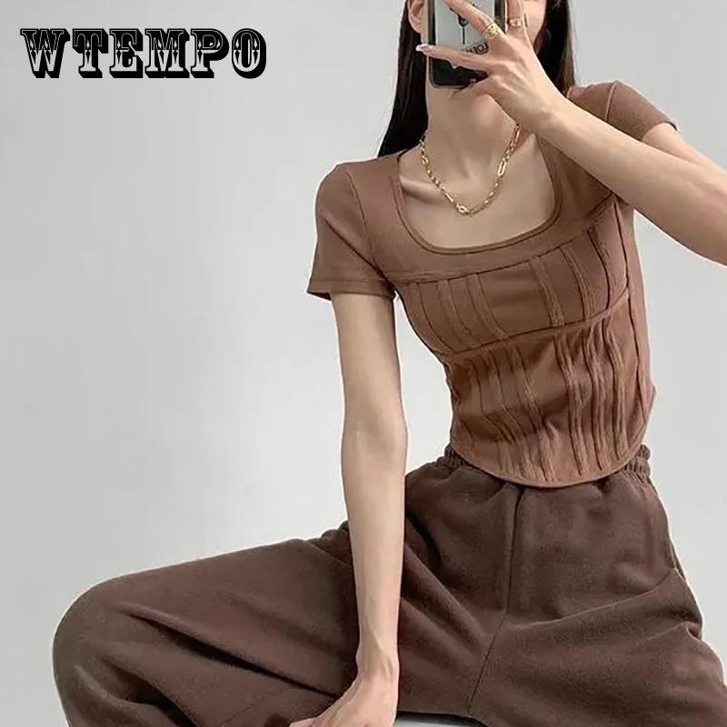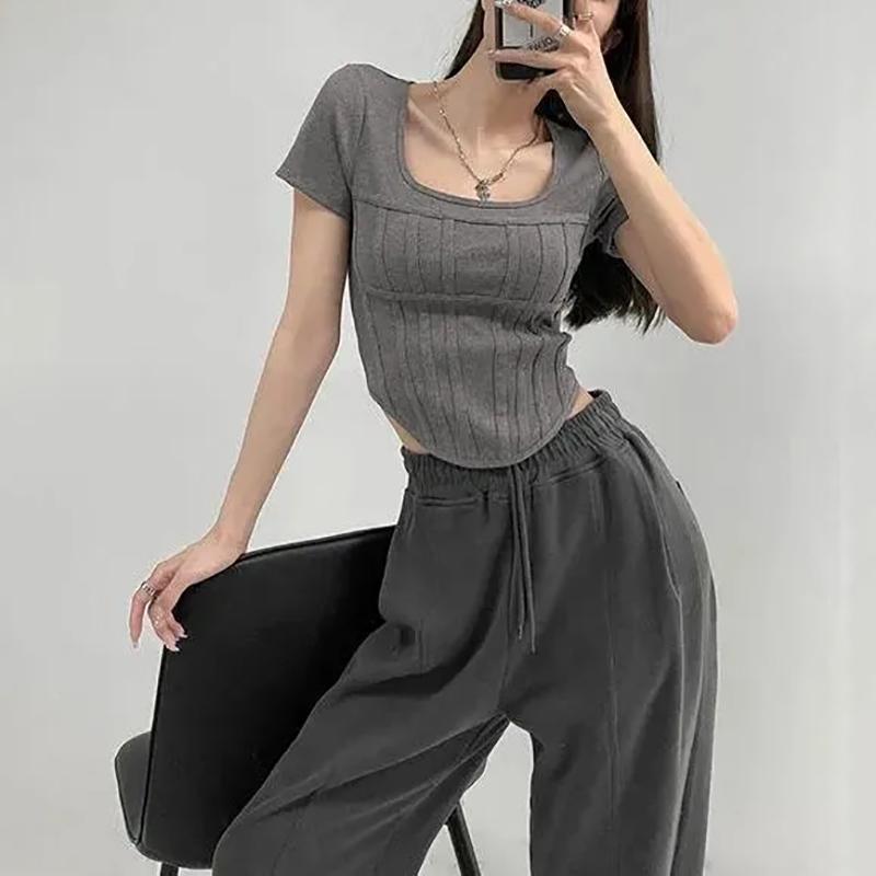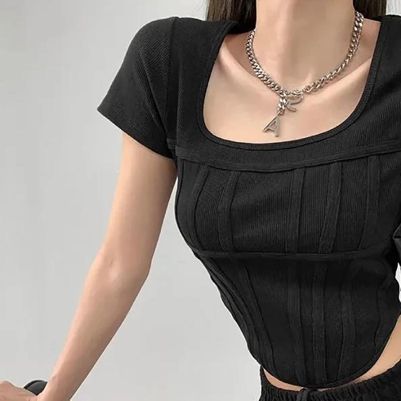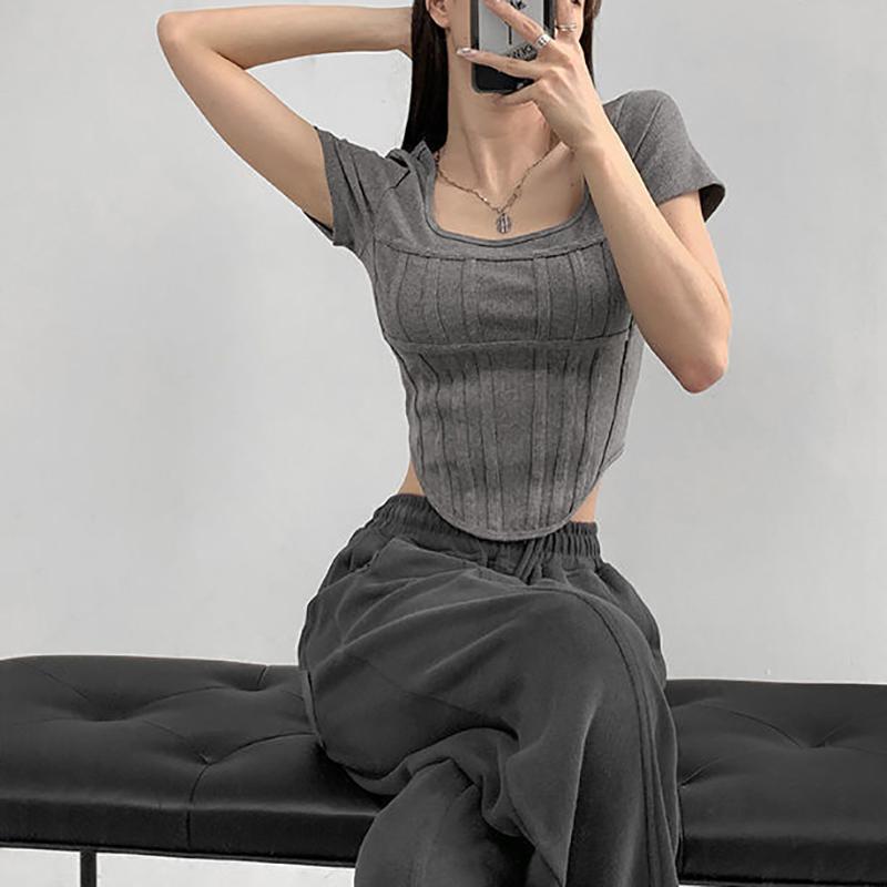 Летняя яркая черная, белая, серая футболка, женские тонкие укороченные топы с квадратным вырезом и короткими рукавами, женские повседневные футболки