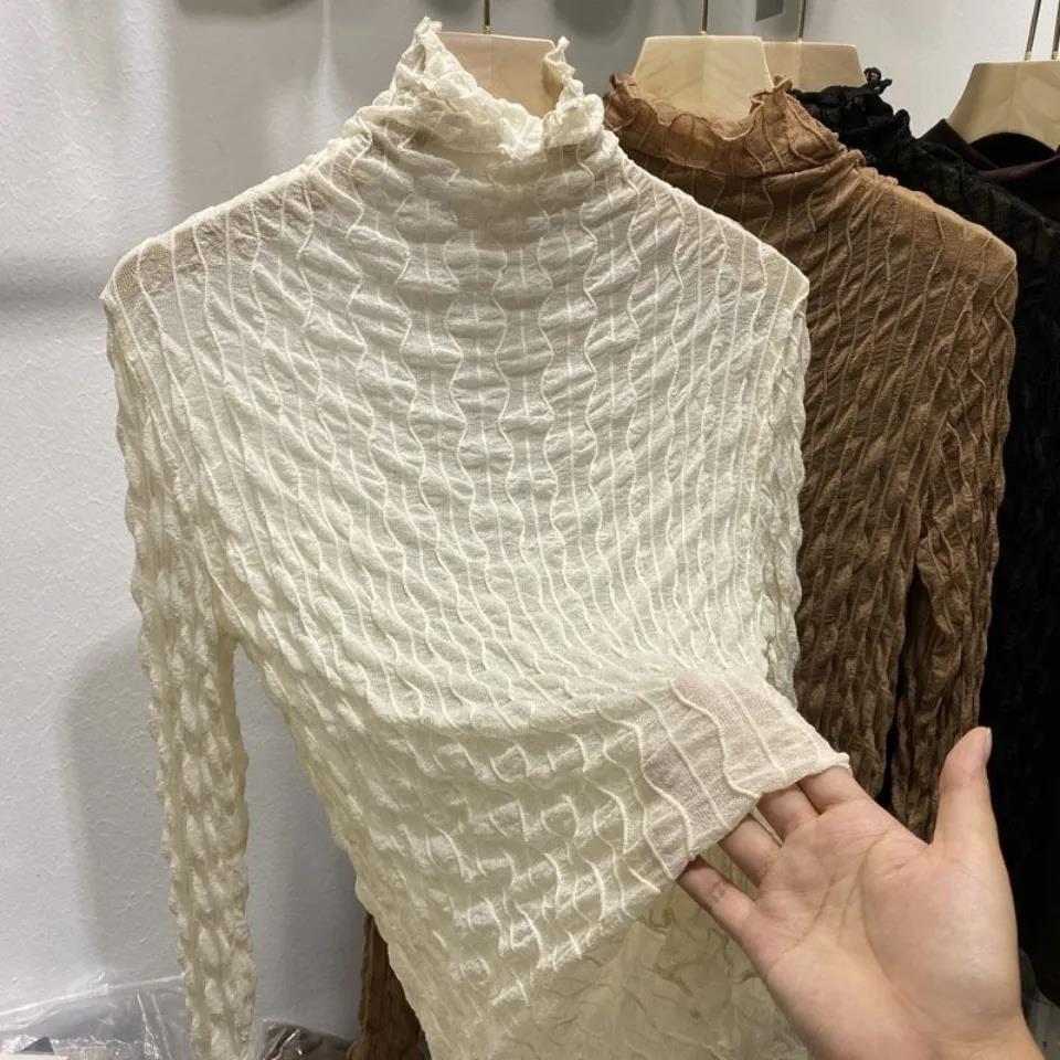 Женские весенне-осенние топы с низом большого размера, однотонные, холодные, тонкий тонкий топ, женские универсальные эластичные кружевные топы