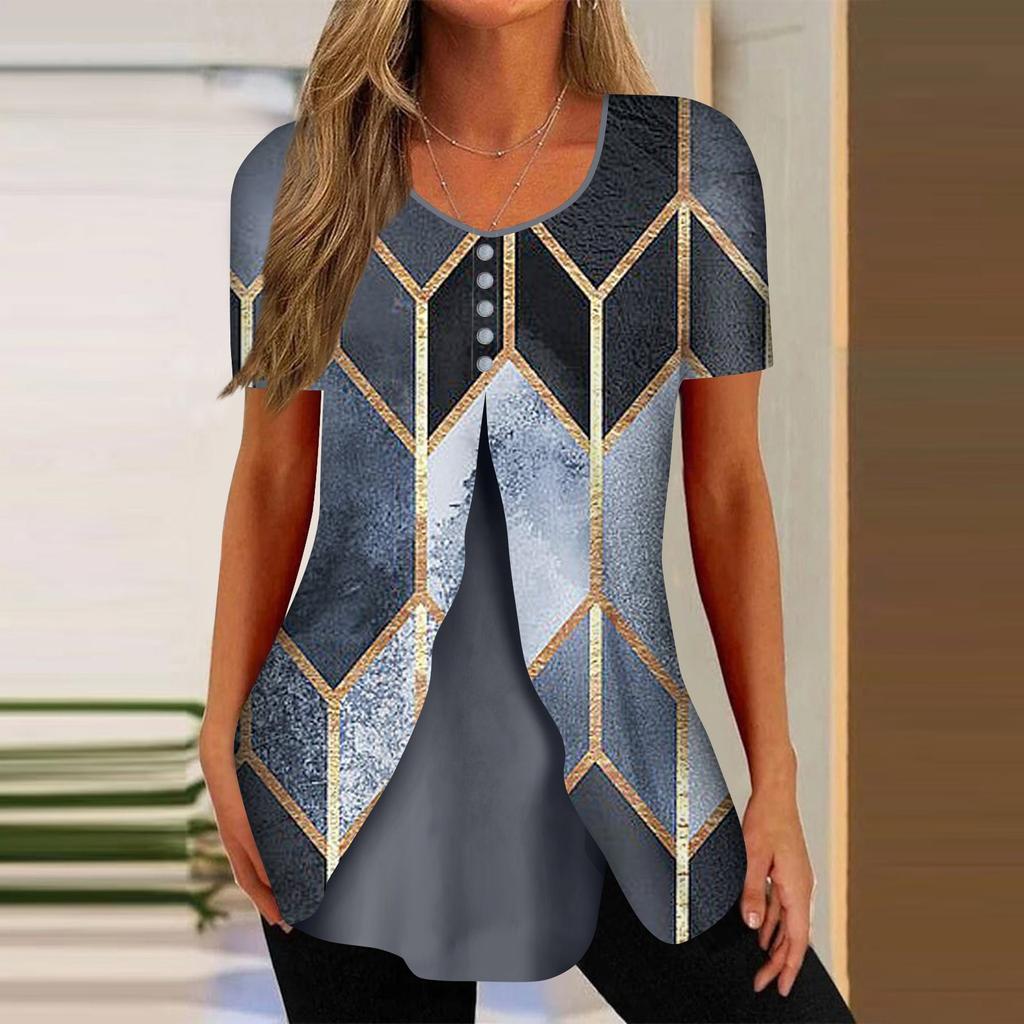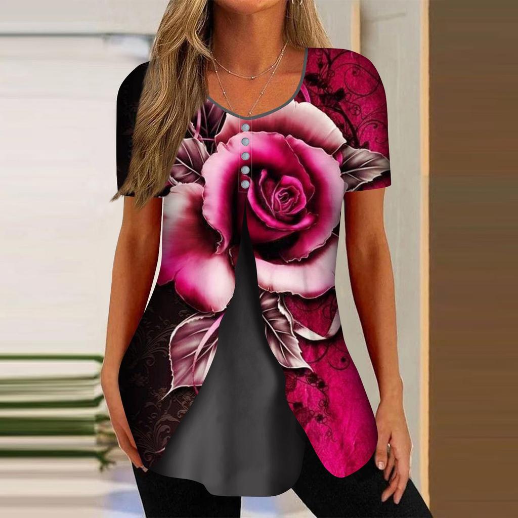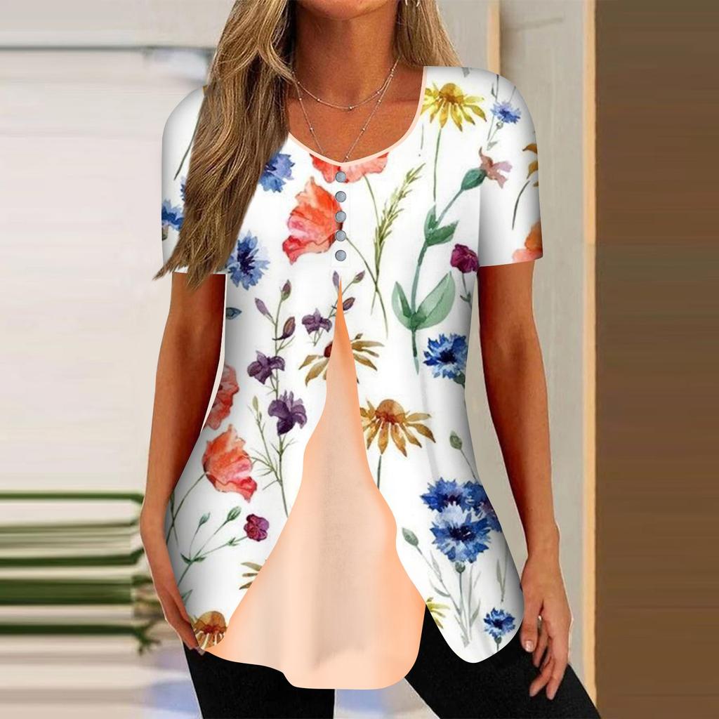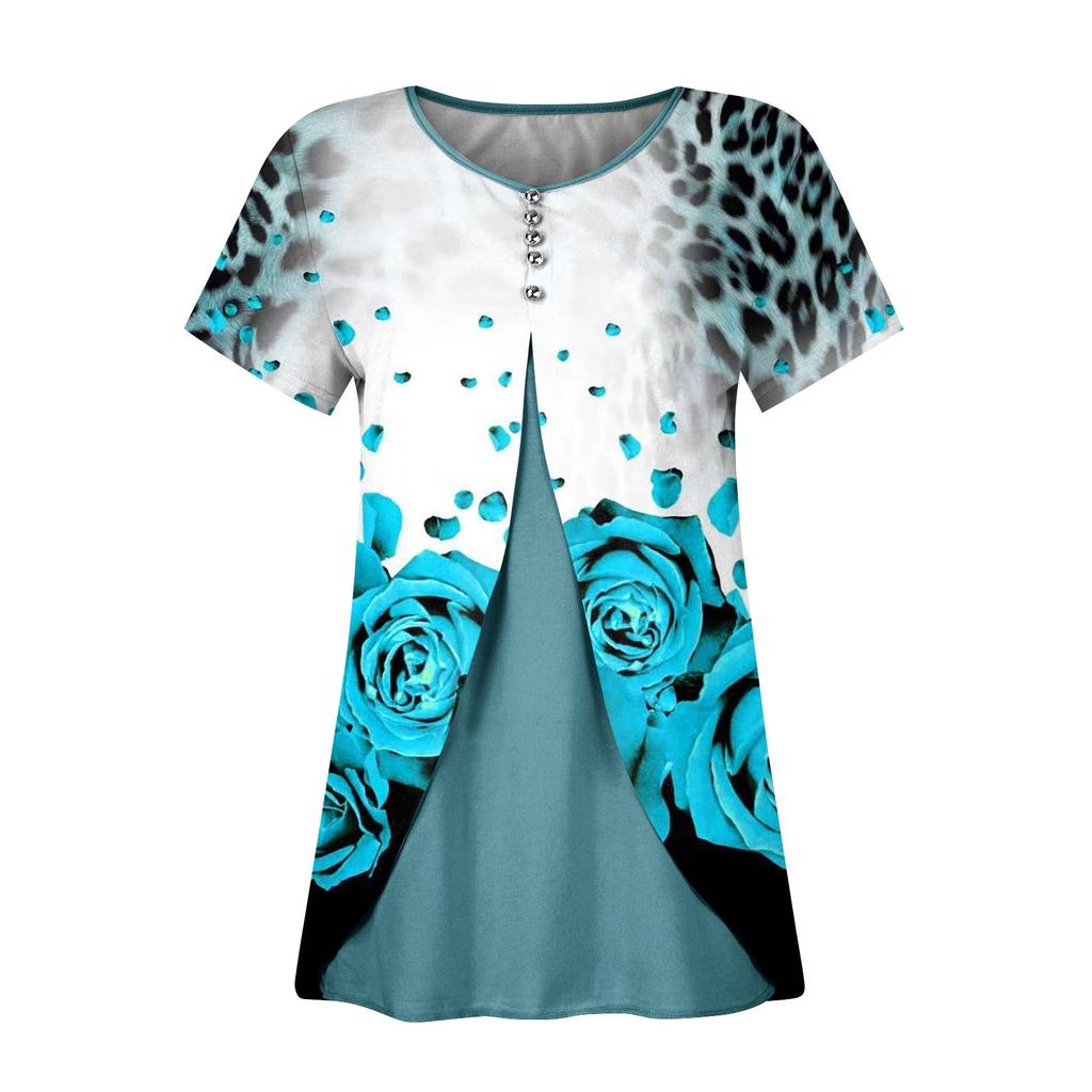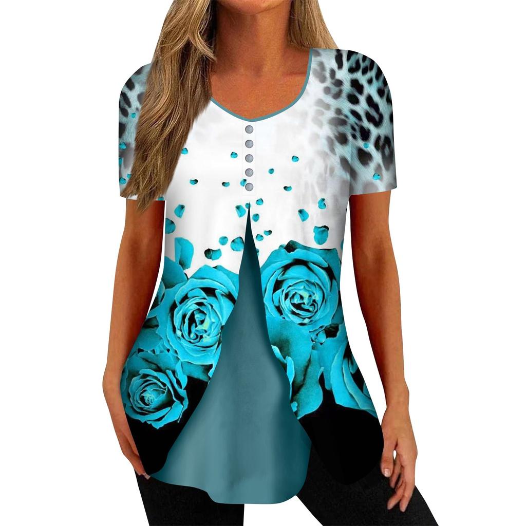 Рубашки для женщин, топы с короткими рукавами, нарядные летние повседневные блузки с v-образным вырезом и нерегулярным подолом с принтом, футболки
