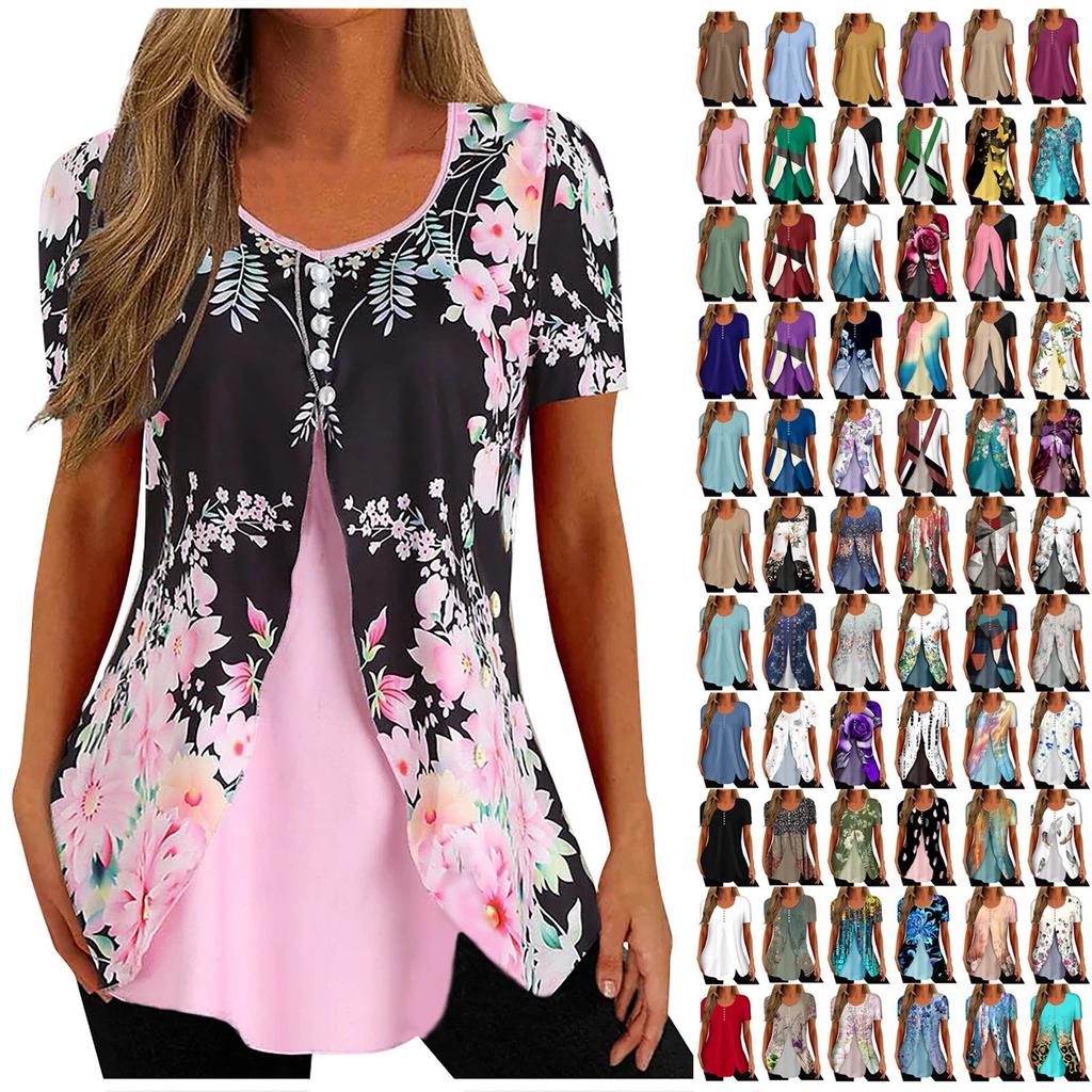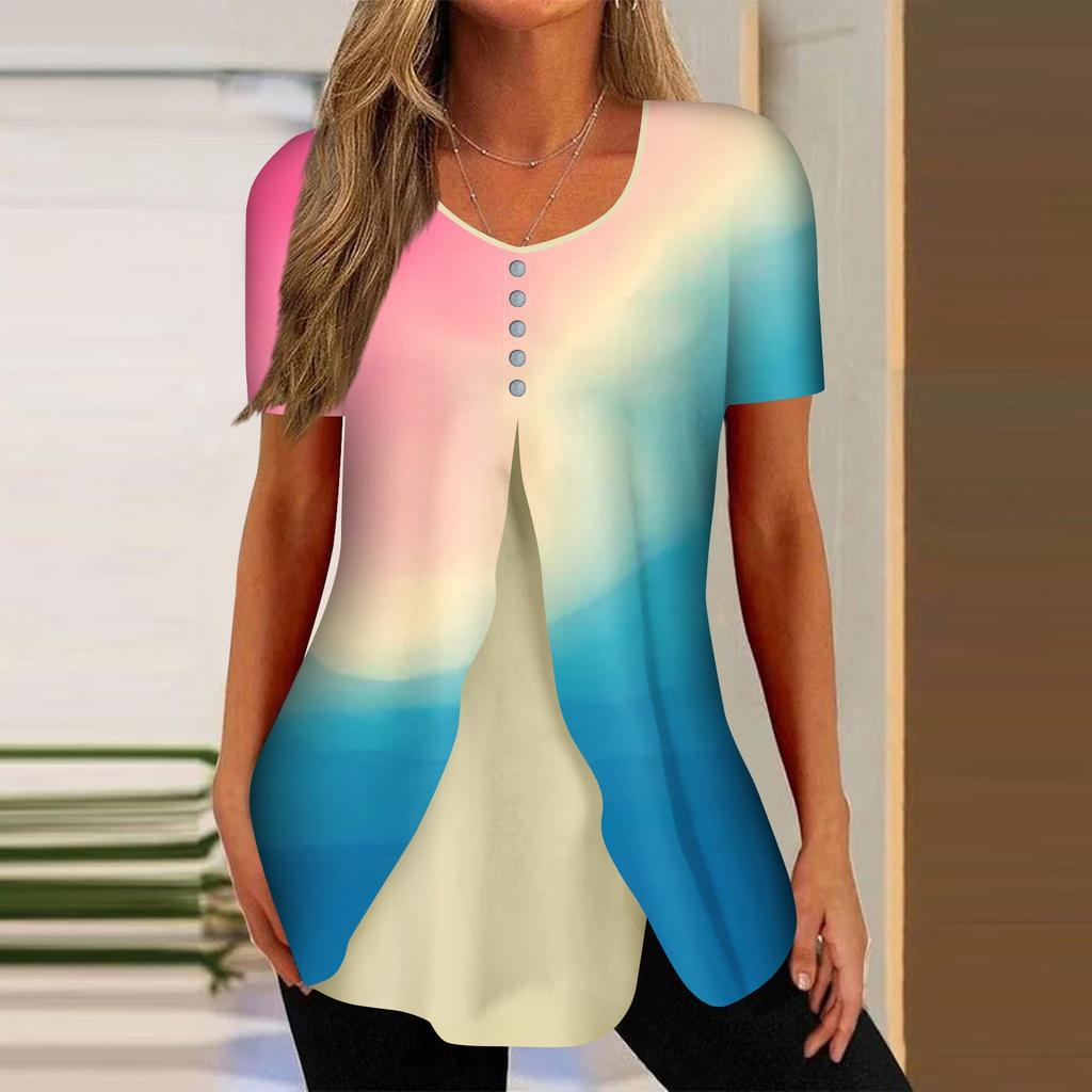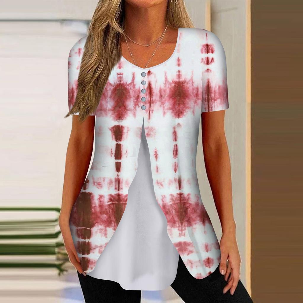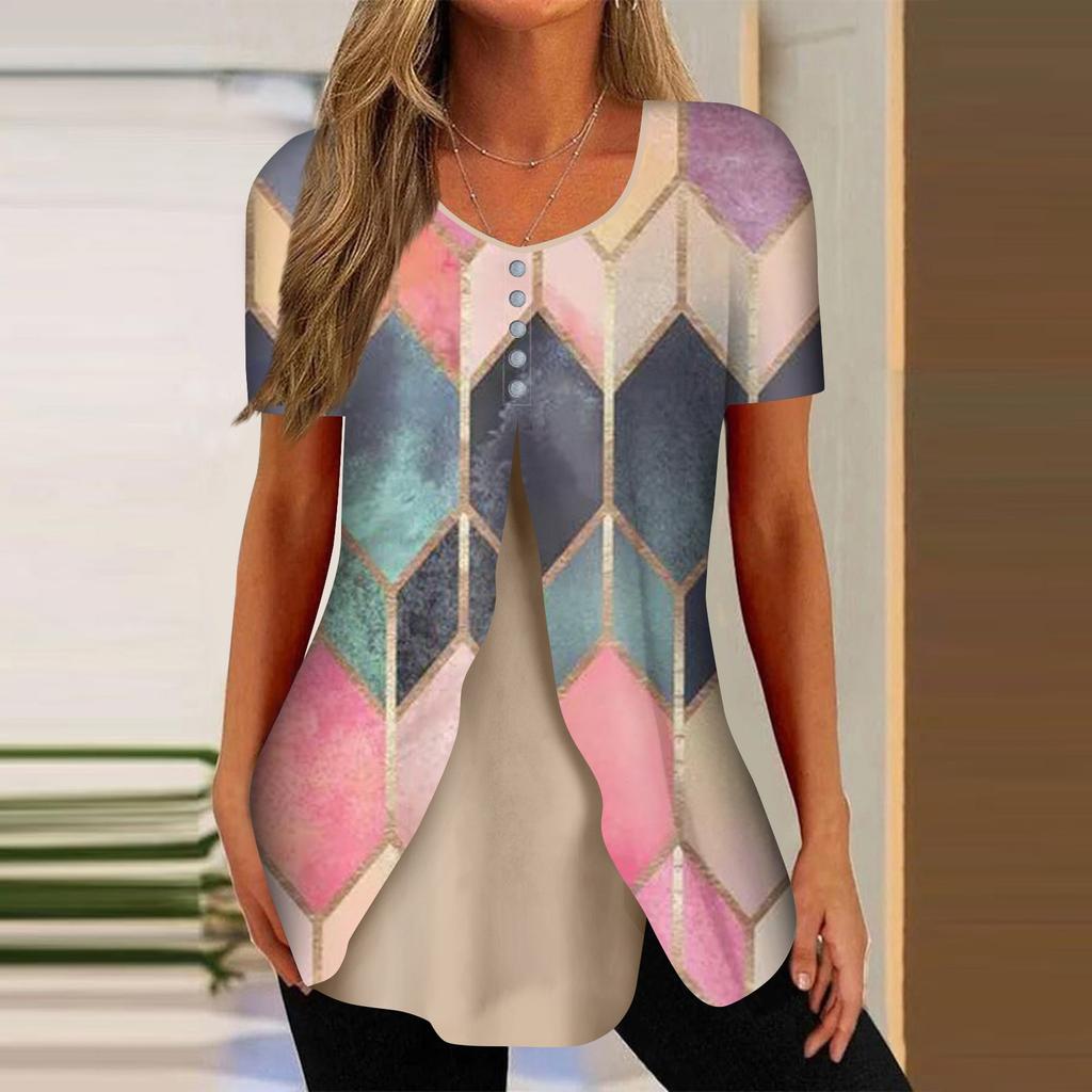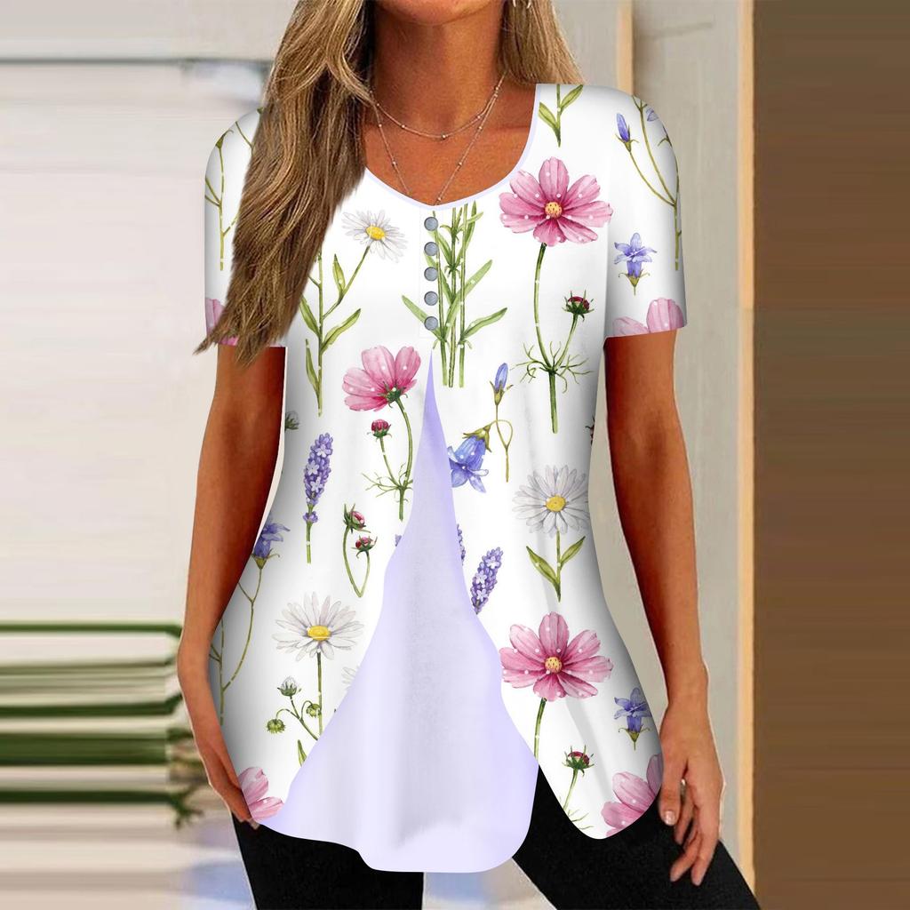 Рубашки для женщин, топы с короткими рукавами, нарядные летние повседневные блузки с v-образным вырезом и нерегулярным подолом с принтом, футболки